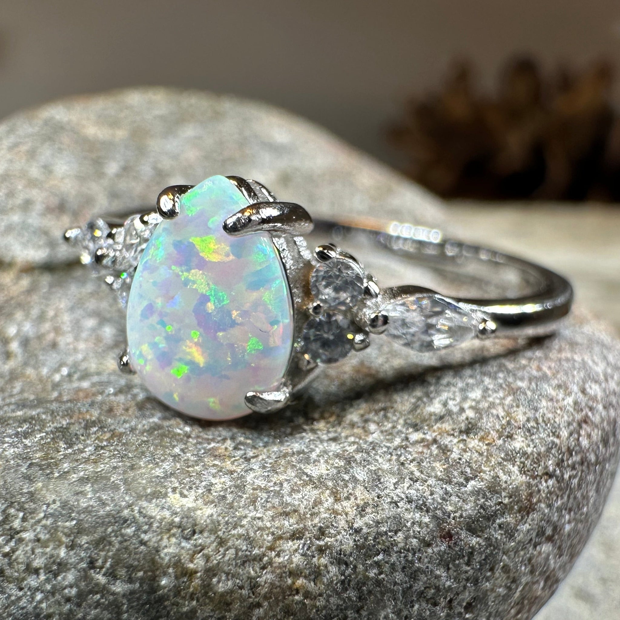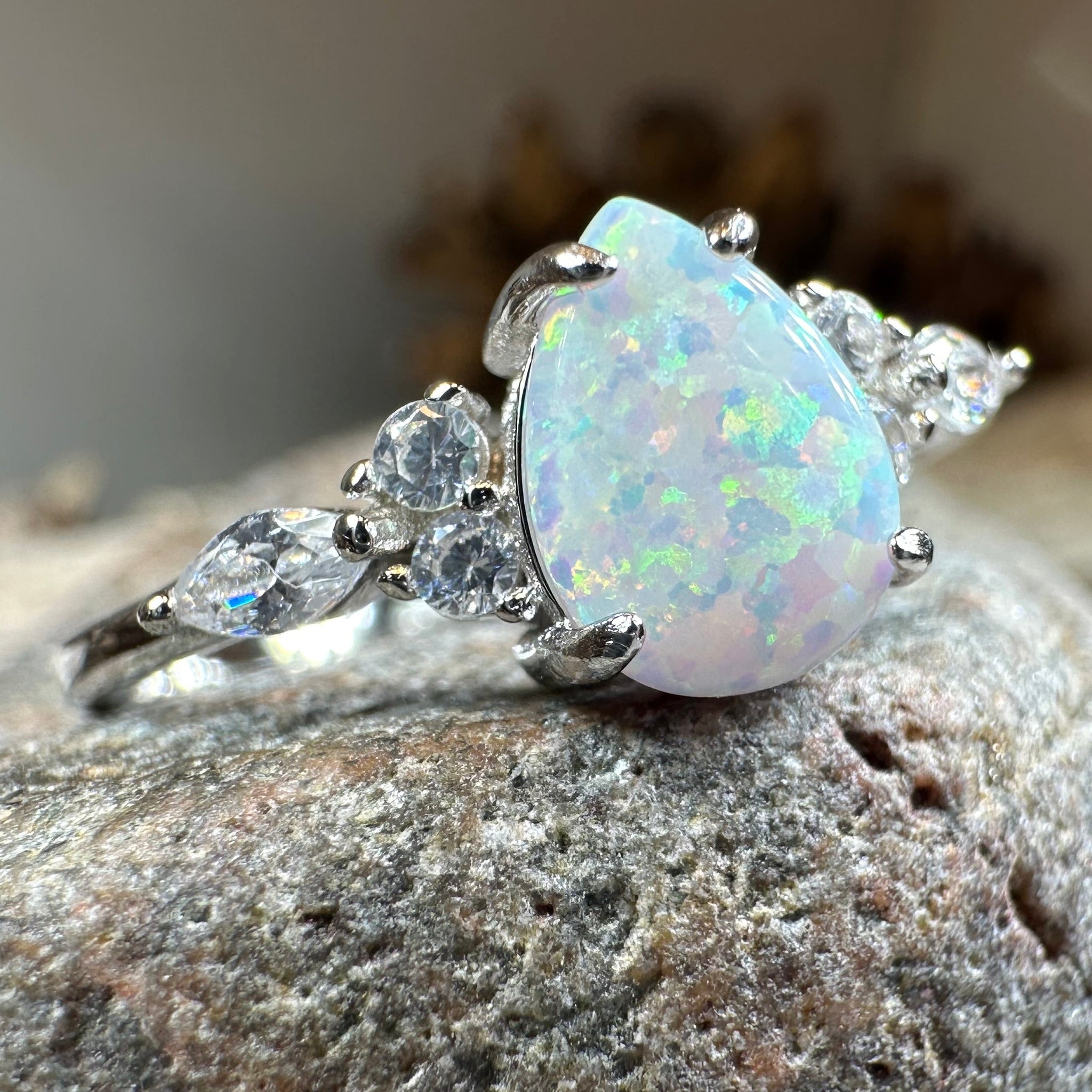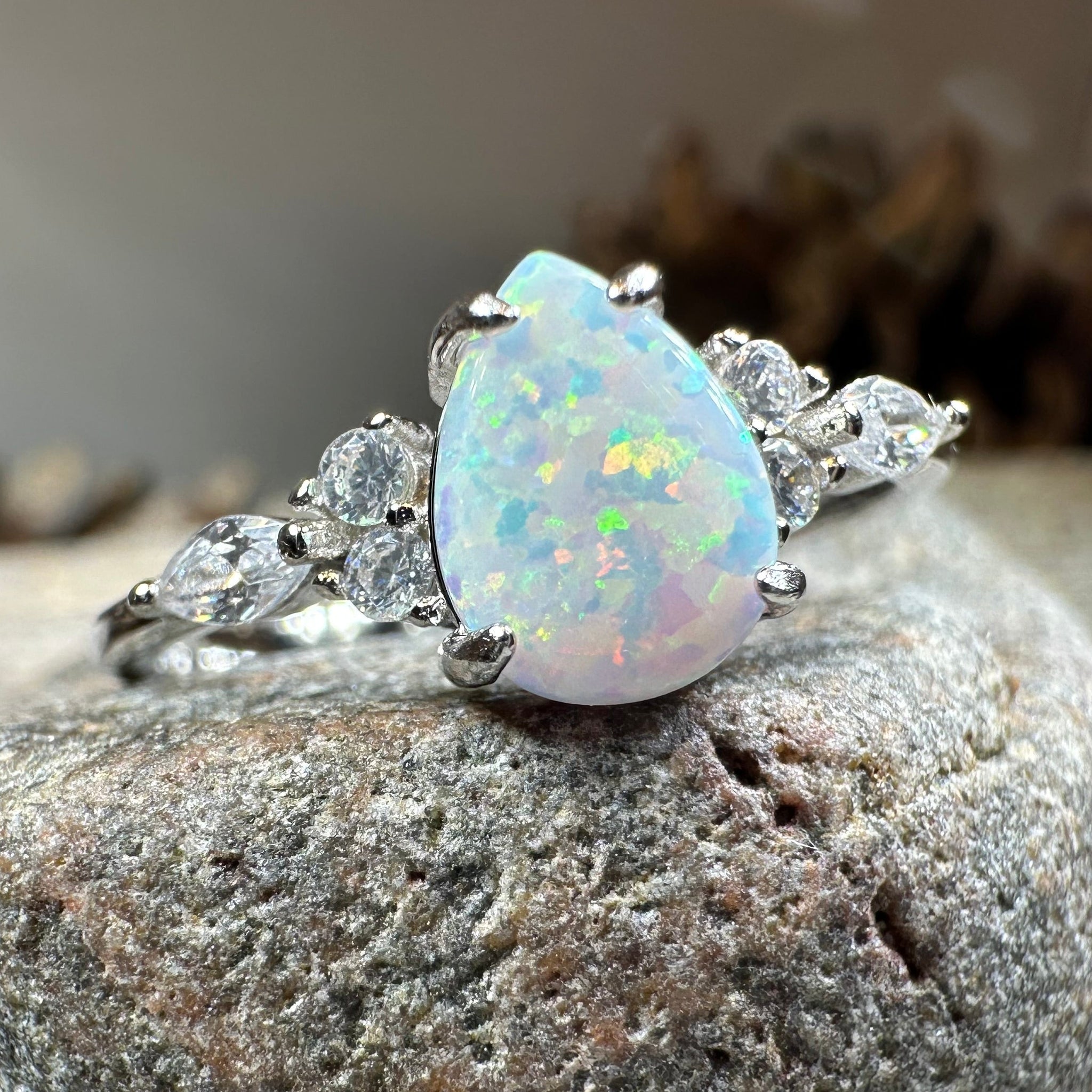Discover timeless elegance with the Allure Whtie Fire Opal Ring, a sophisticated piece that captures light and imagination. This refined design features a stunning pear shaped white fire lab-created opal as its centerpiece, complemented by 6 brilliant lab-created diamond gemstones that frame the stone with understated glamour.