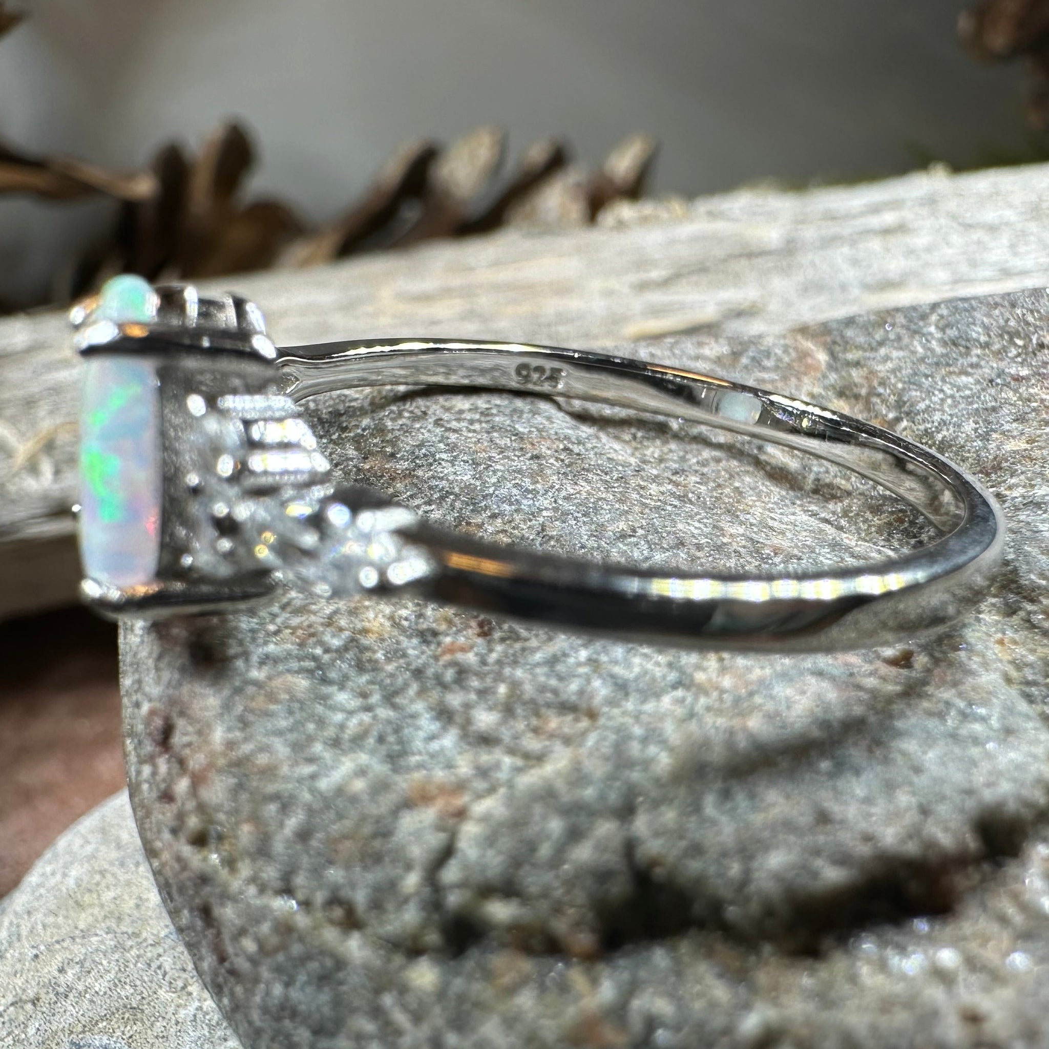 The delicate composition is expertly set in highly polished sterling silver, creating a luminous contrast that enhances the opal's mesmerizing glow. Sparkling zircon accents add additional brilliance on the sides of the band, while intricate detailing elevates this petite ring to wearable art.