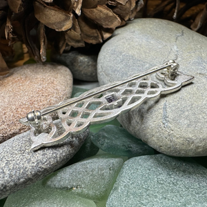 Solid Sterling Silver - 2" x 1/2" with .75 carat faceted amethyst gemstone. 1 1/2" locking silver pin on the back of the brooch.
