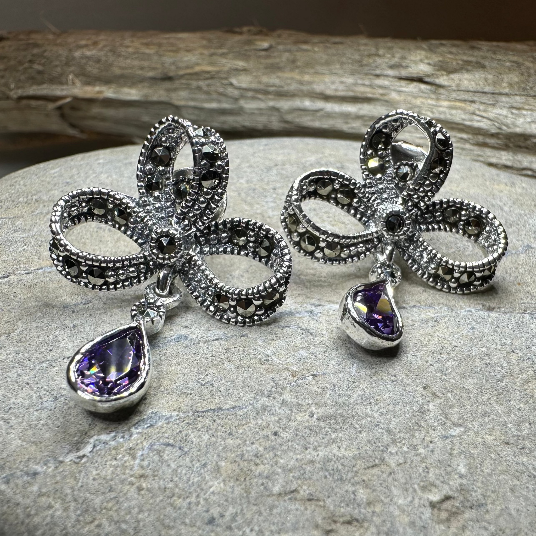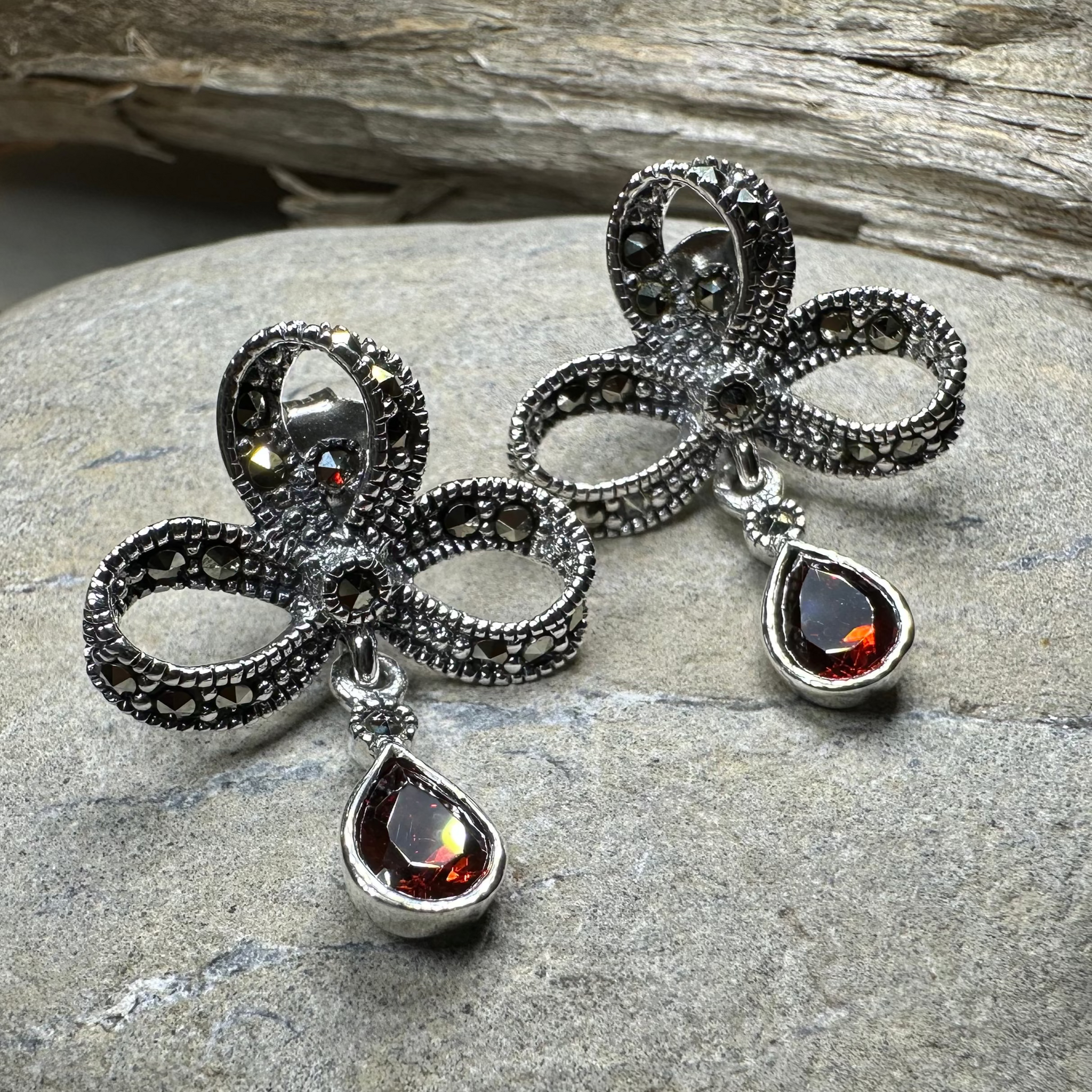 Solid Sterling Silver with sparkling marcasite and gemstone dangle.