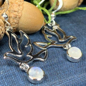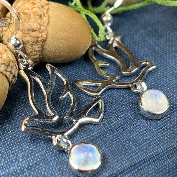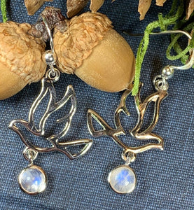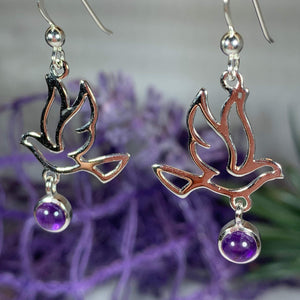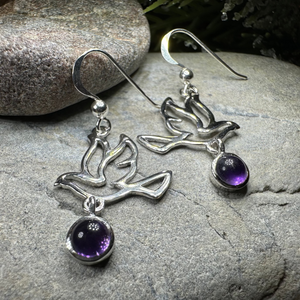 These lovely earrings are inspired by the dove of peace at Iona Abbey in Scotland, featuring a charming amethyst gemstone and dainty Celtic designs.