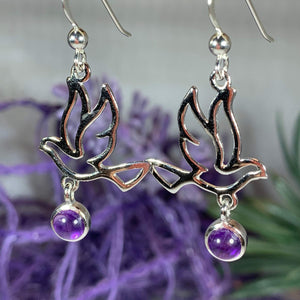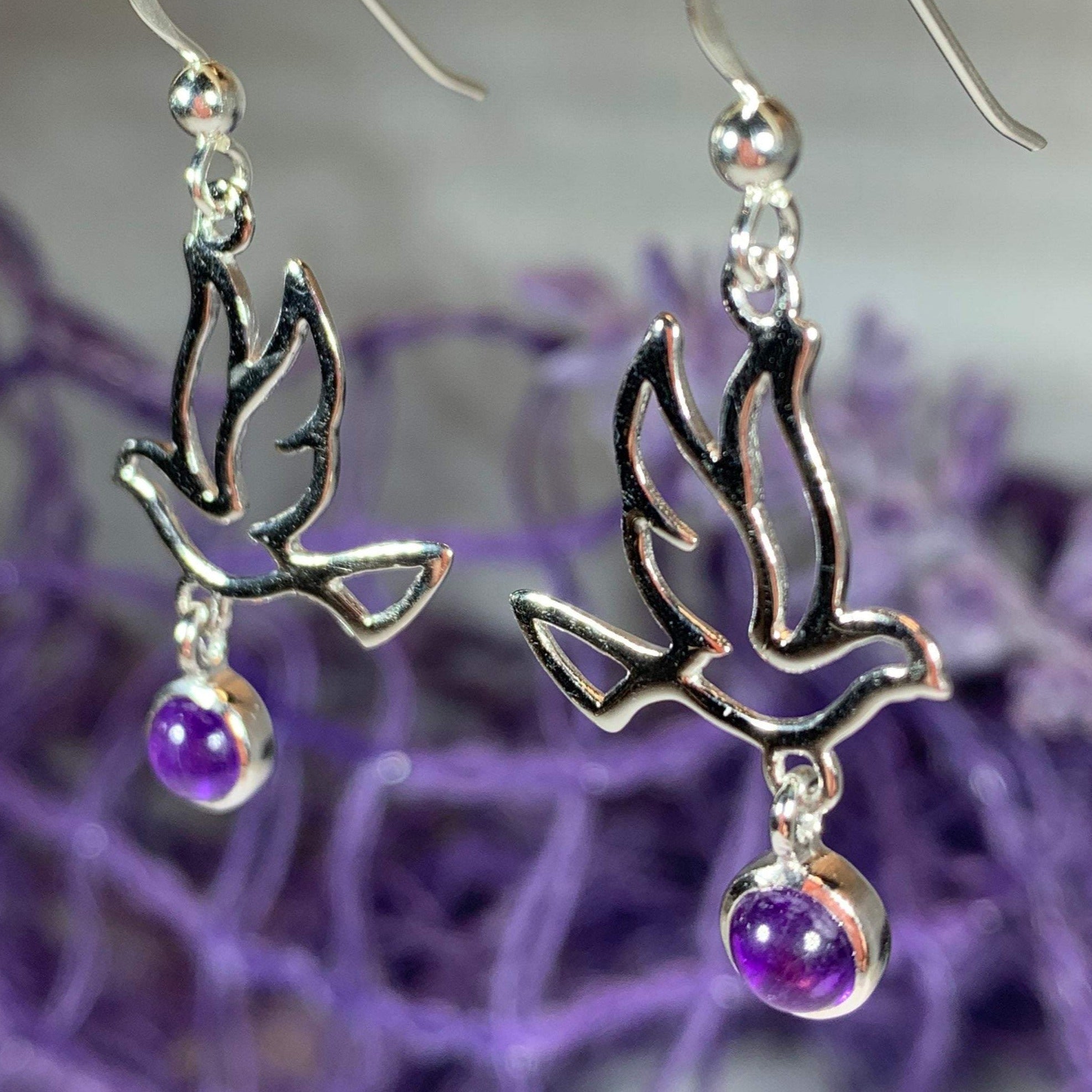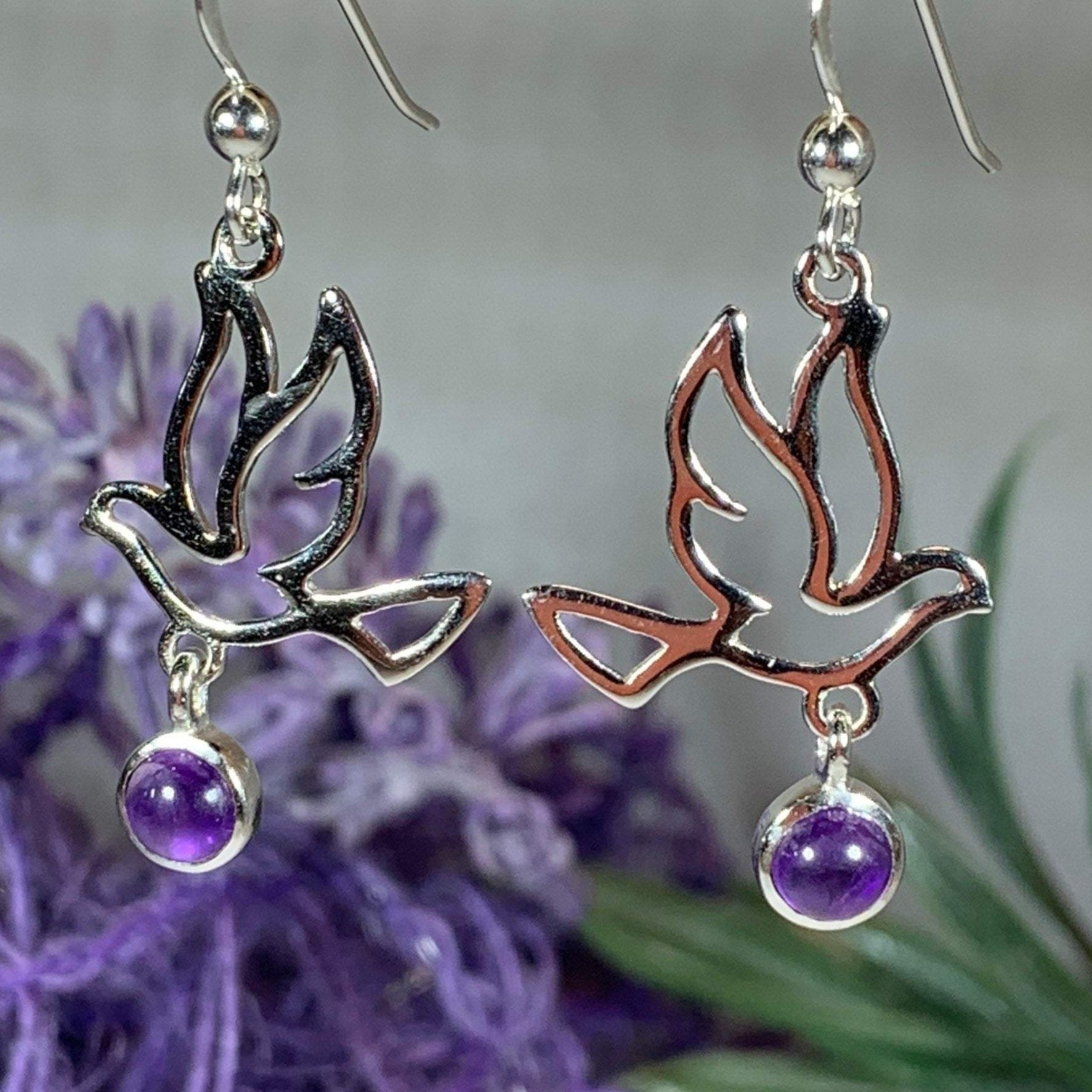 Solid Sterling Silver Dove Dangle Earrings with authentic amethyst stone.