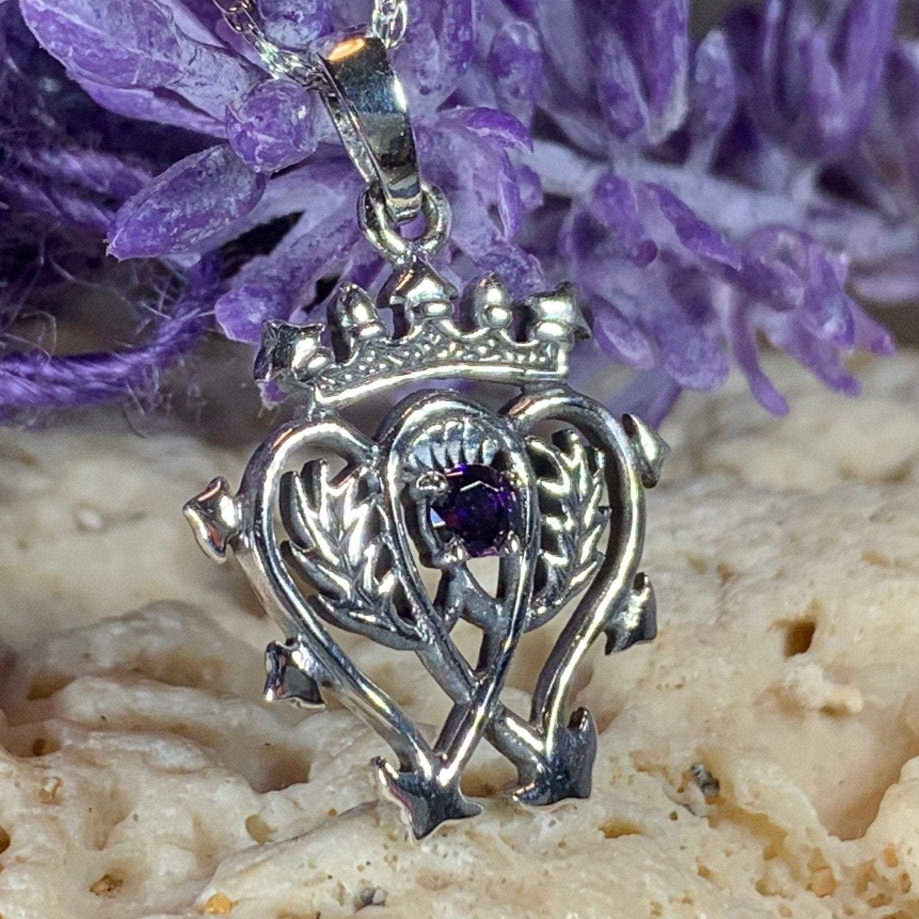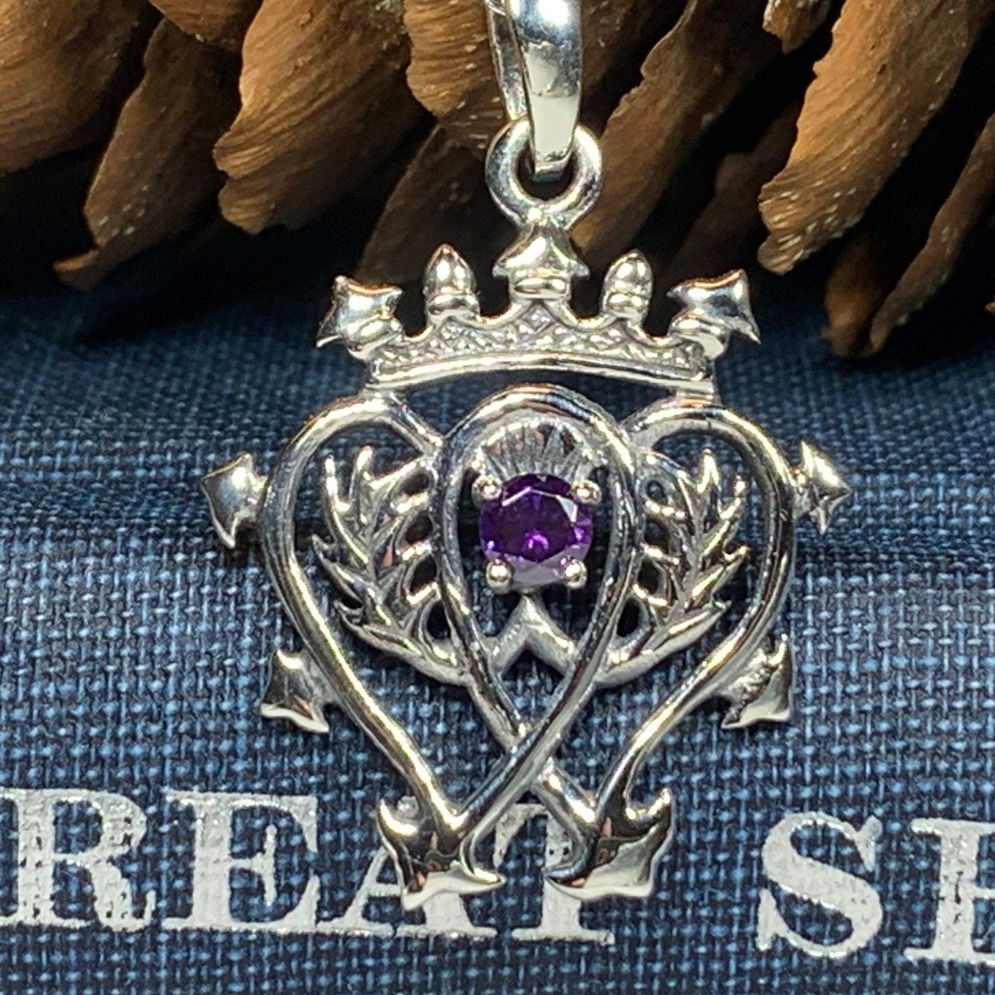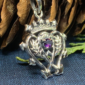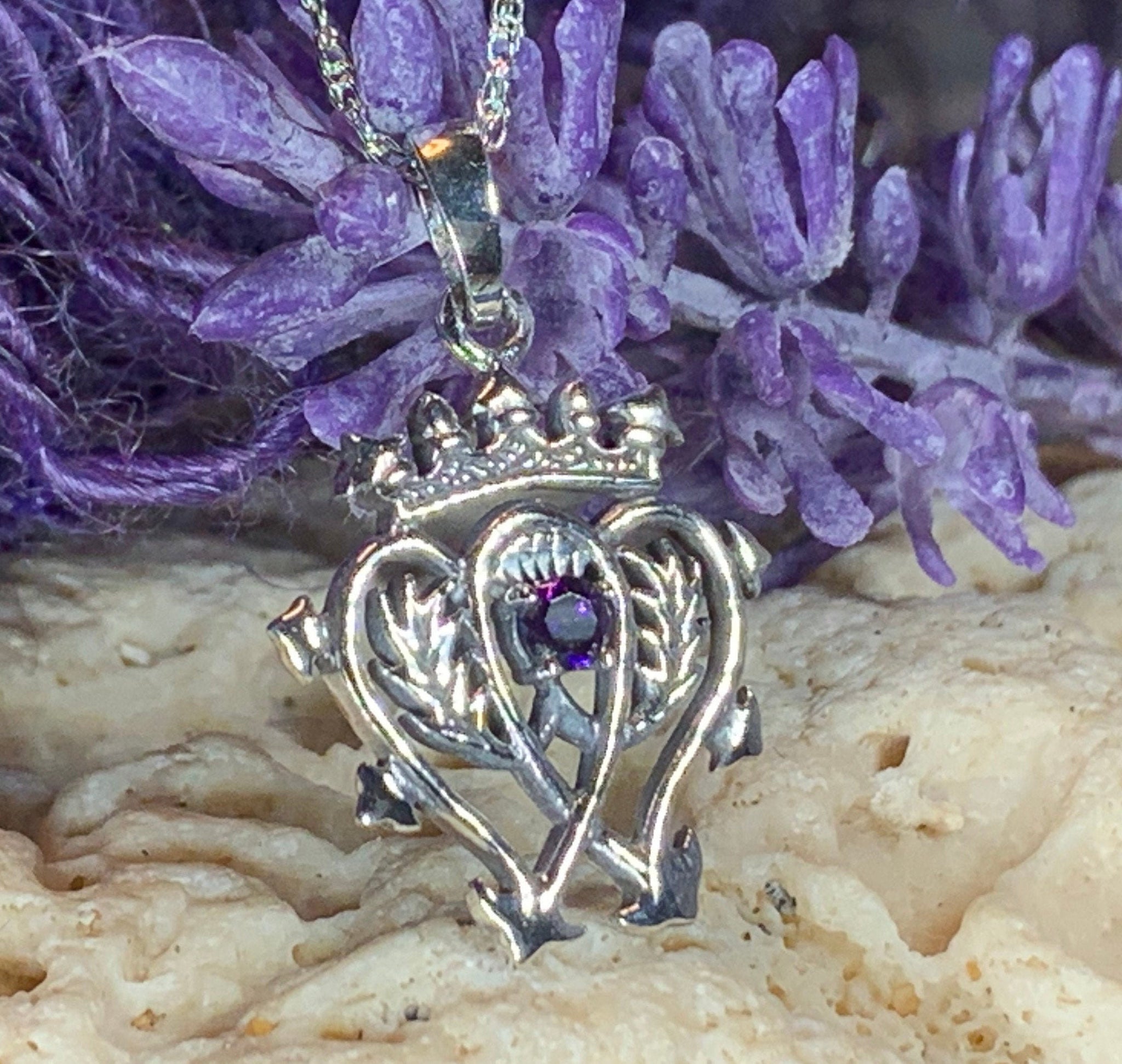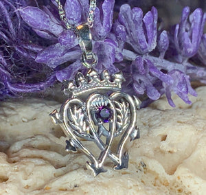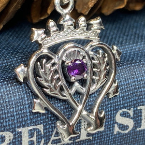 A beautiful Sterling Silver Pendant with a design based on the unique Luckenbooth design. The symbolic design consists of the interlocking hearts surmounted by the crown of Mary Queen of Scots. This piece is made extra special with having an amethyst stone in the center.