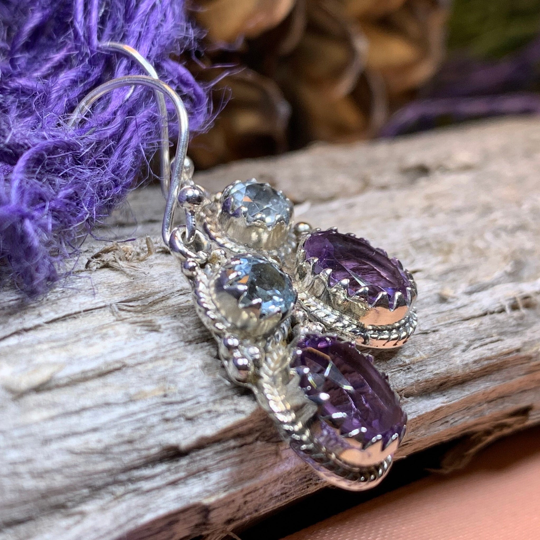 A unique design of deep purple amethyst gemstone adorned with authentic faceted blue topaz - an attractive and feminine earring - solid sterling silver.