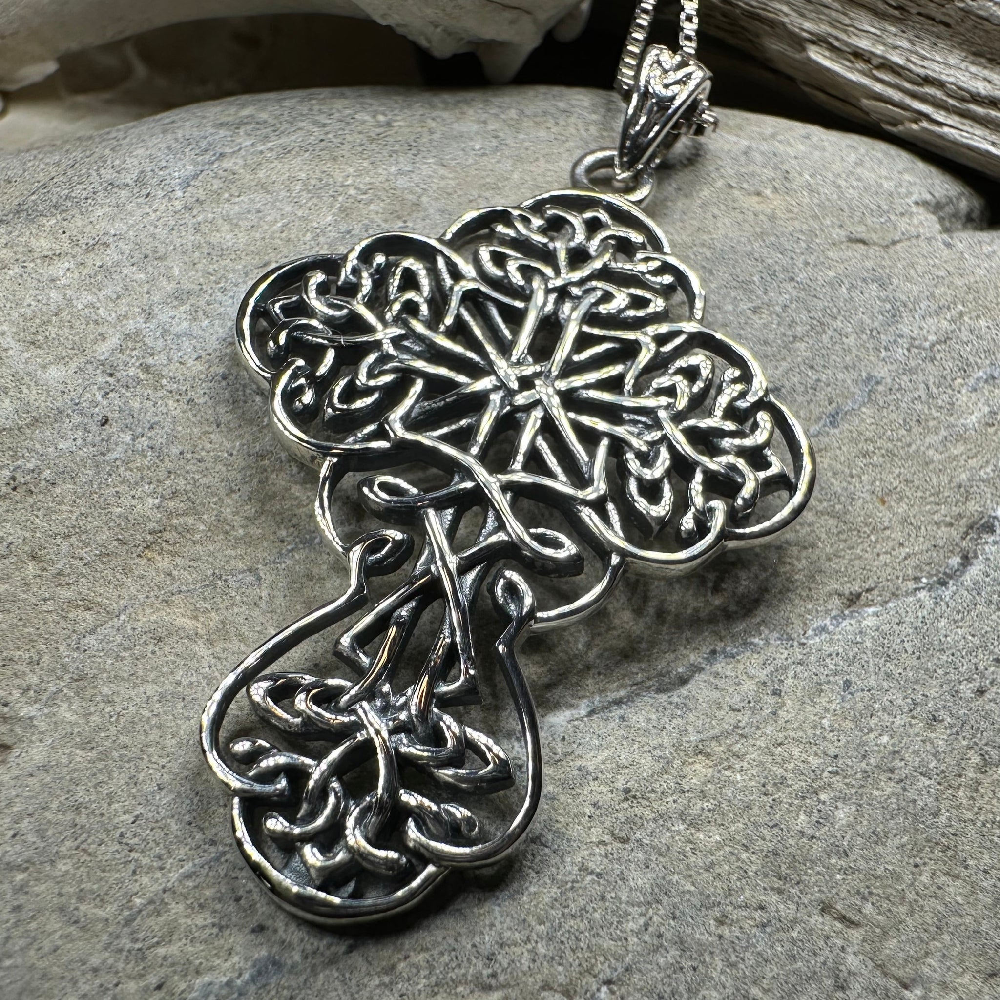 This beautifully crafted Celtic Sterling Silver Cross draws design influence from ancient medieval cathedral crosses throughout Europe.