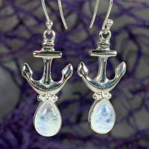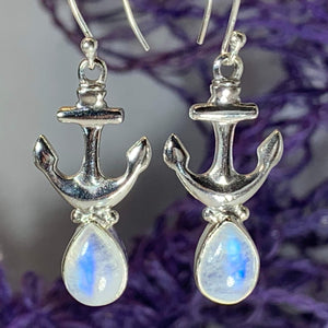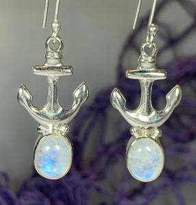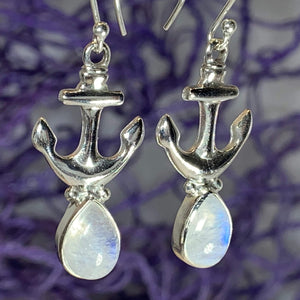 1" x 1/2" size anchors in solid sterling silver with a 2 carat teardrop or oval moonstone on each earring.