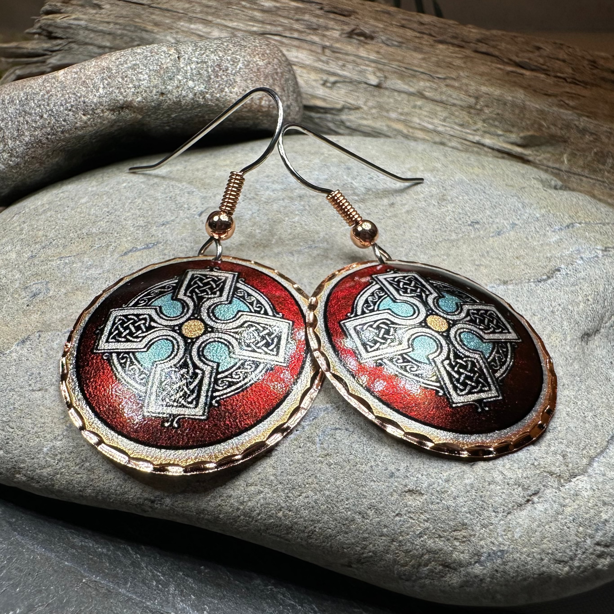 Discover the beauty of our Copper Celtic Earrings, handcrafted with care. These exquisite Dangle Earrings feature a Celtic Cross pattern in shades of red, blue, silver, gold, and black.