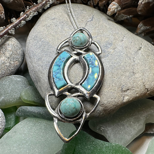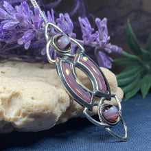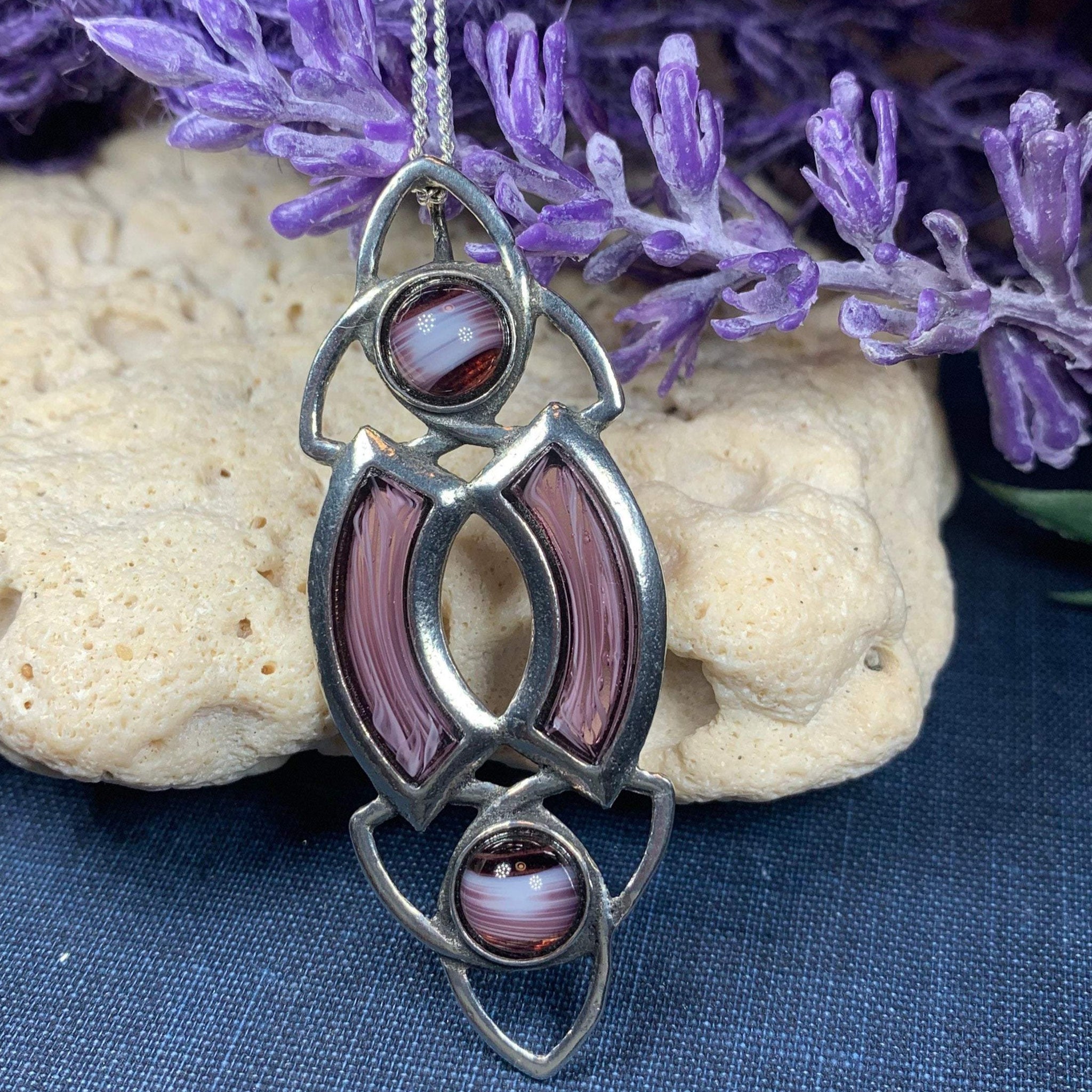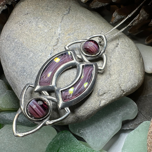 Antiqued pewter pendant with an ancient Celtic design and four deeply colored glass stones.