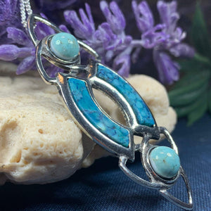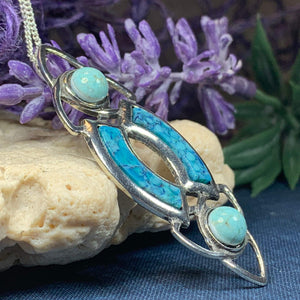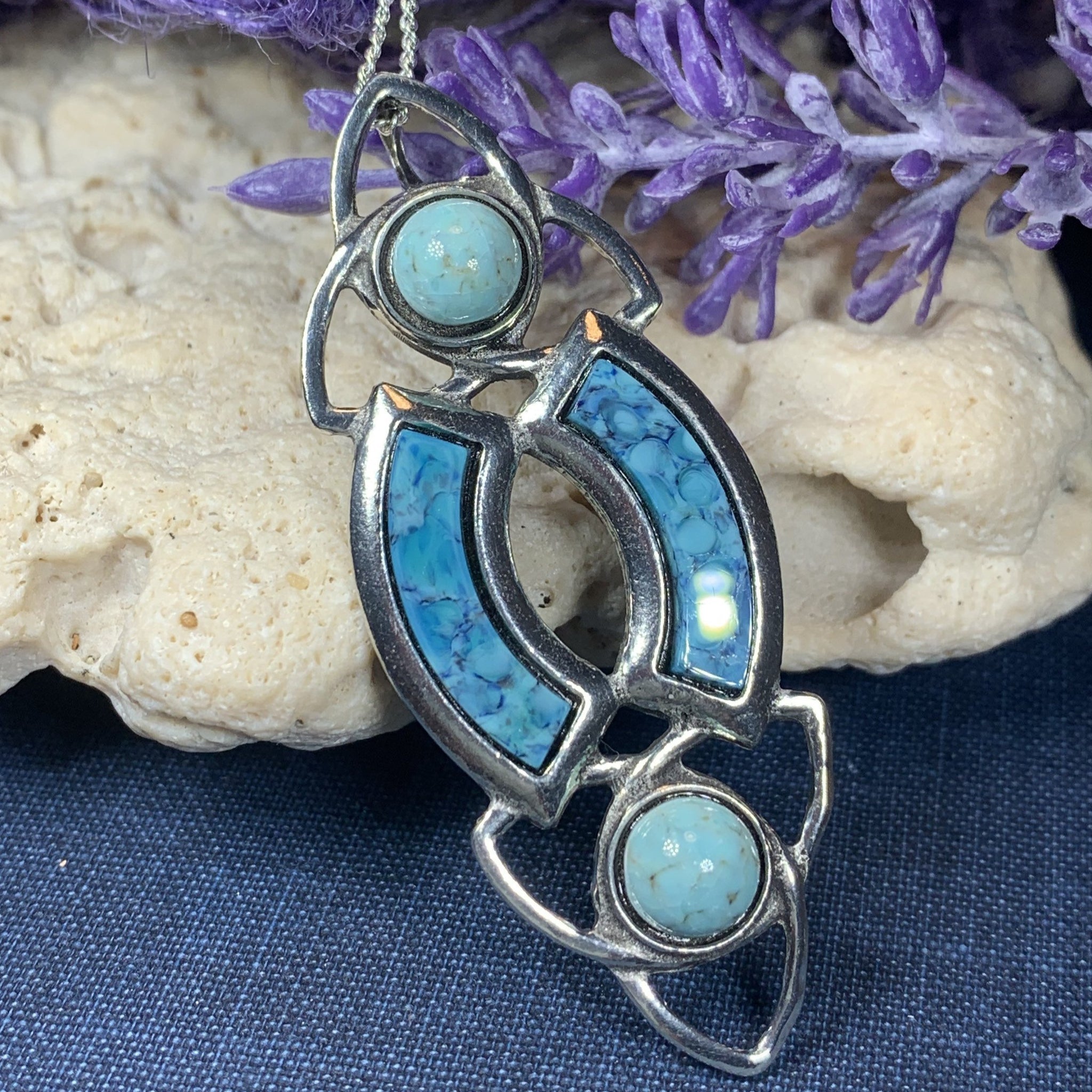 Beautiful and unique design that will look lovely with any outfit - a very unique work of art. This is a large sized statement necklace with beautiful color that pops. The top and bottom of the design feature a trinity knot - the eternal and ancient symbol with so many beautiful meanings. This is a piece that you will wear time and again!