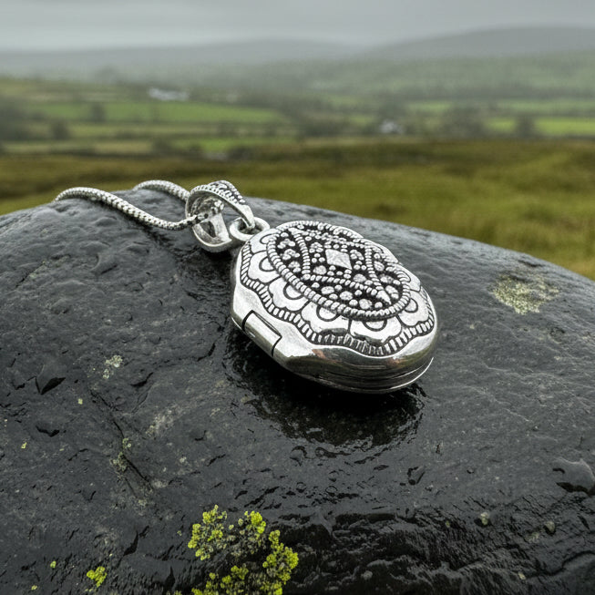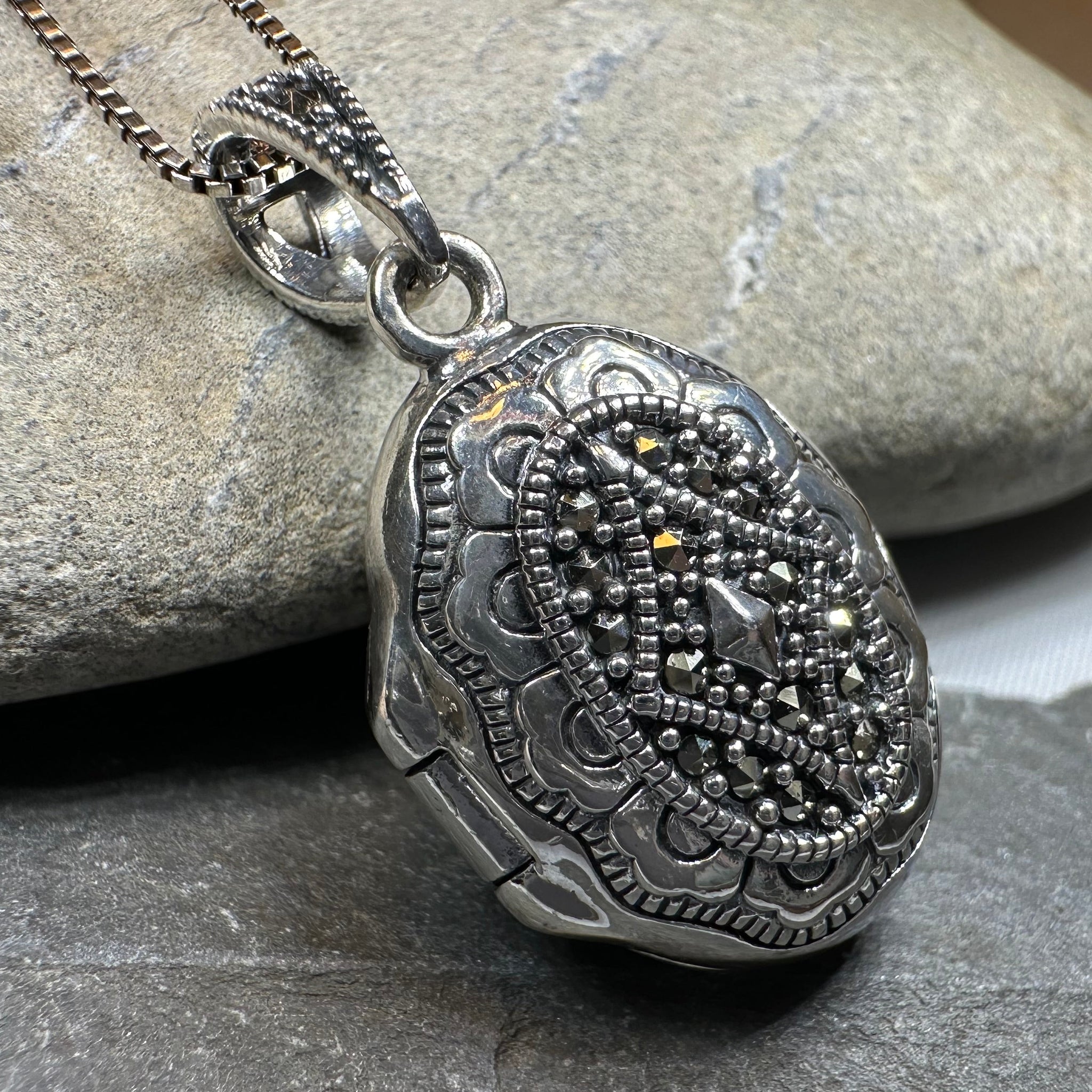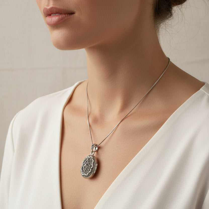 This timeless locket captures the elegance of classic design with its intricate marcasite gemstone detailing. Crafted in solid sterling silver, it embodies refined femininity and sophistication—a piece worthy of becoming a cherished family heirloom.