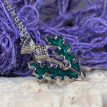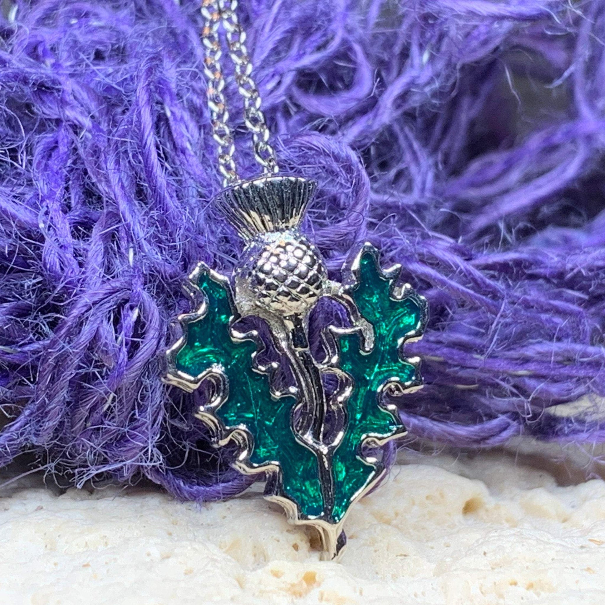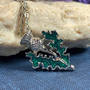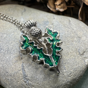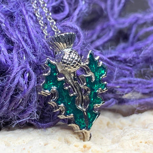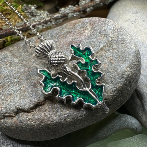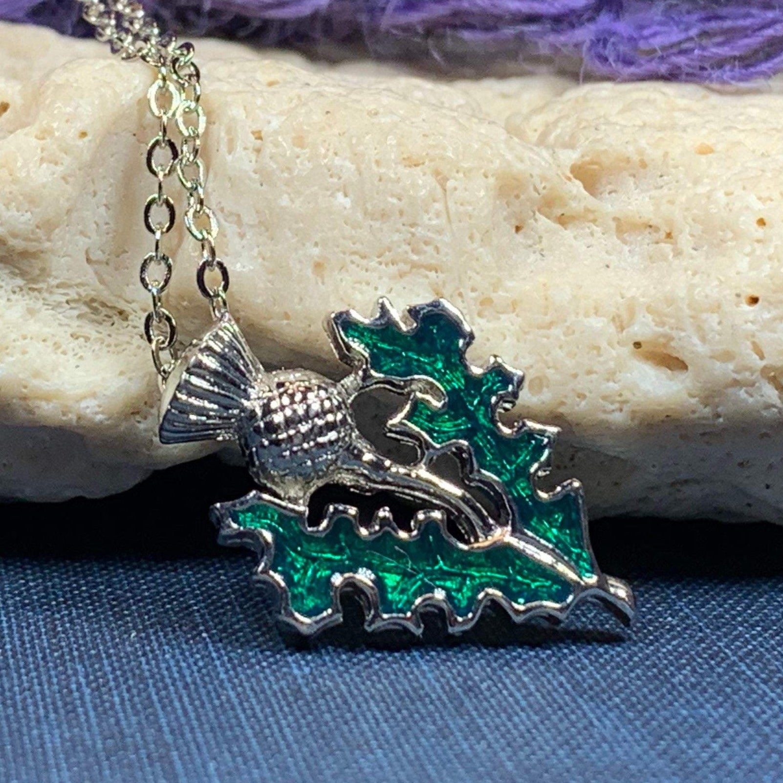 This stunning, Scottish necklace effortlessly fuses Celtic style with contemporary jewelry design. A wild thistle with the leaves done in a green enamel on an 18" pewter chain. A thoughtful gift for your loved one or a beautiful treat for yourself! Pewter with green enamel.