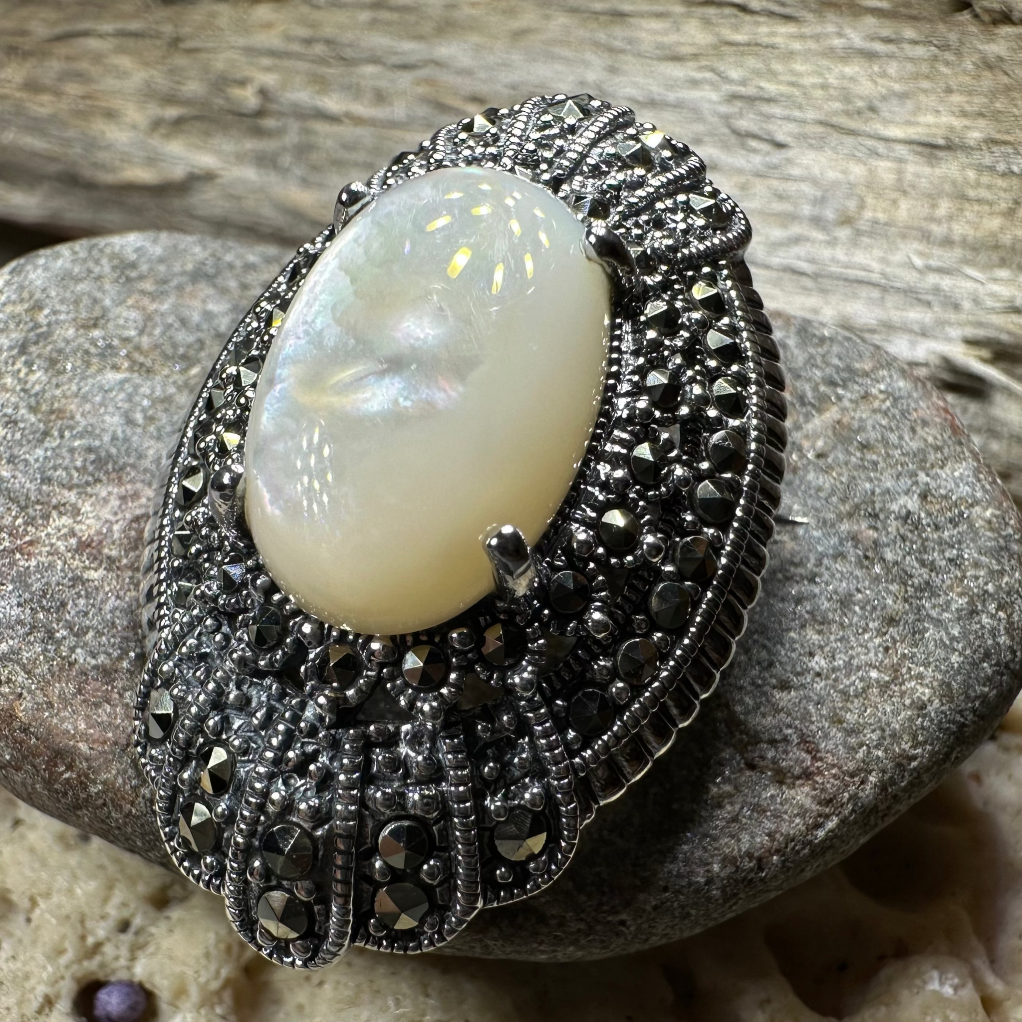 Solid Sterling Silver Celtic Brooch with detailed Celtic knotwork and authentic green agate or black onyx cabochons and sparkling marcasite gemstones. A beautiful vintage style finish that is perfect for any lover of Celtic culture!