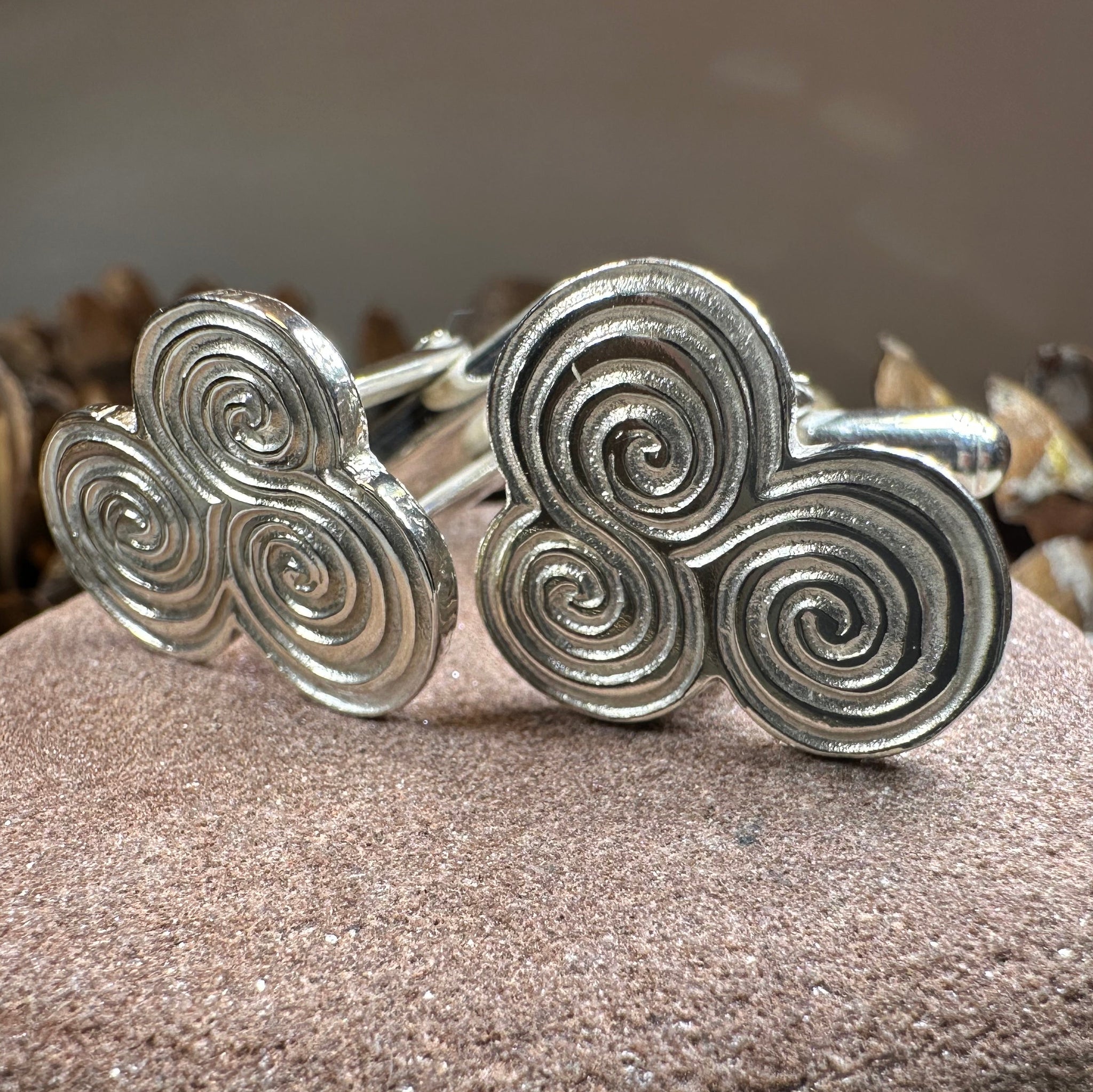 These beautiful Celtic Spiral cuff links are a unique piece that is based on a detail from the famous Newgrange Entrance Stone in County Meath, Ireland.