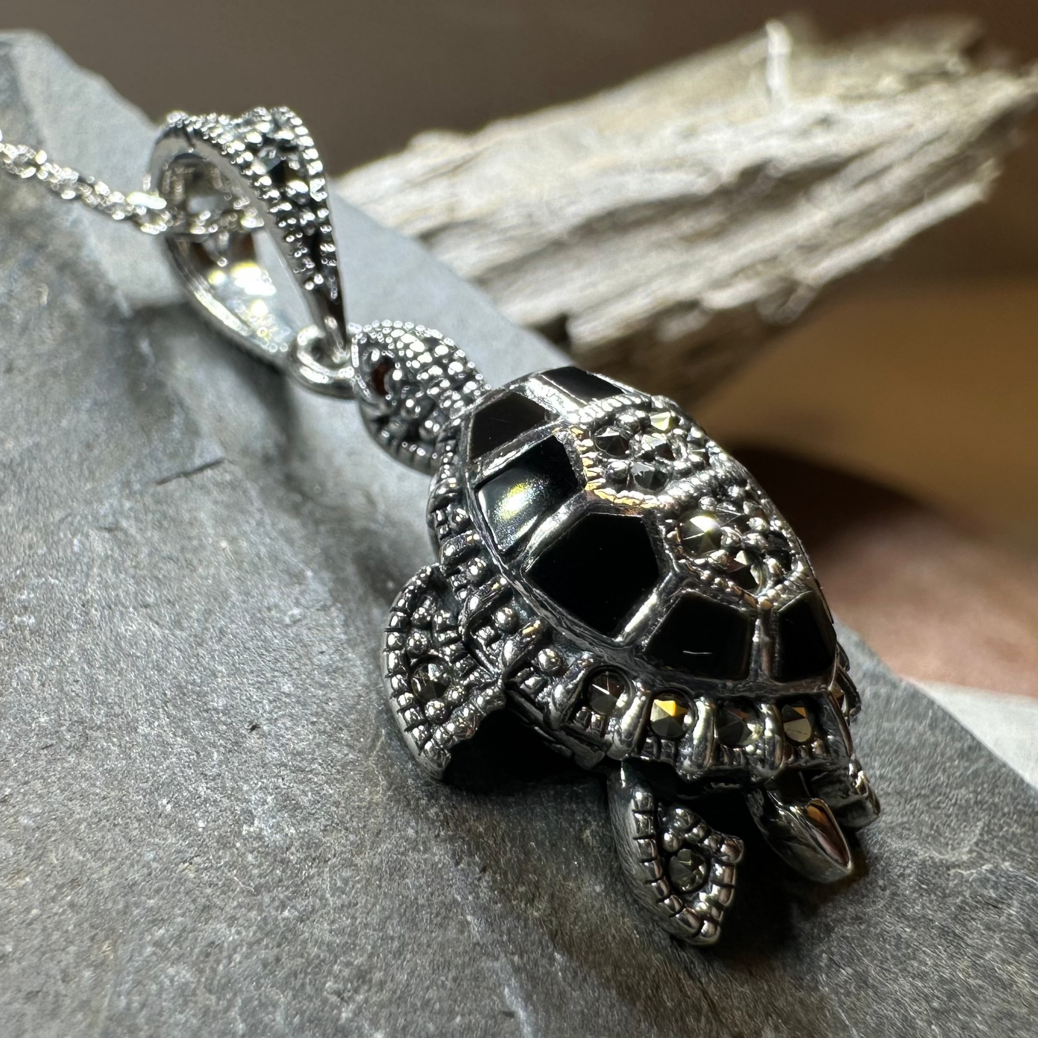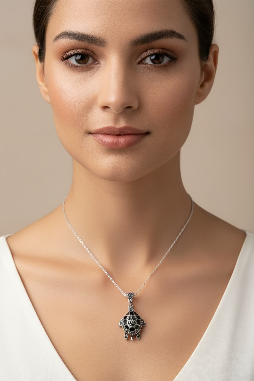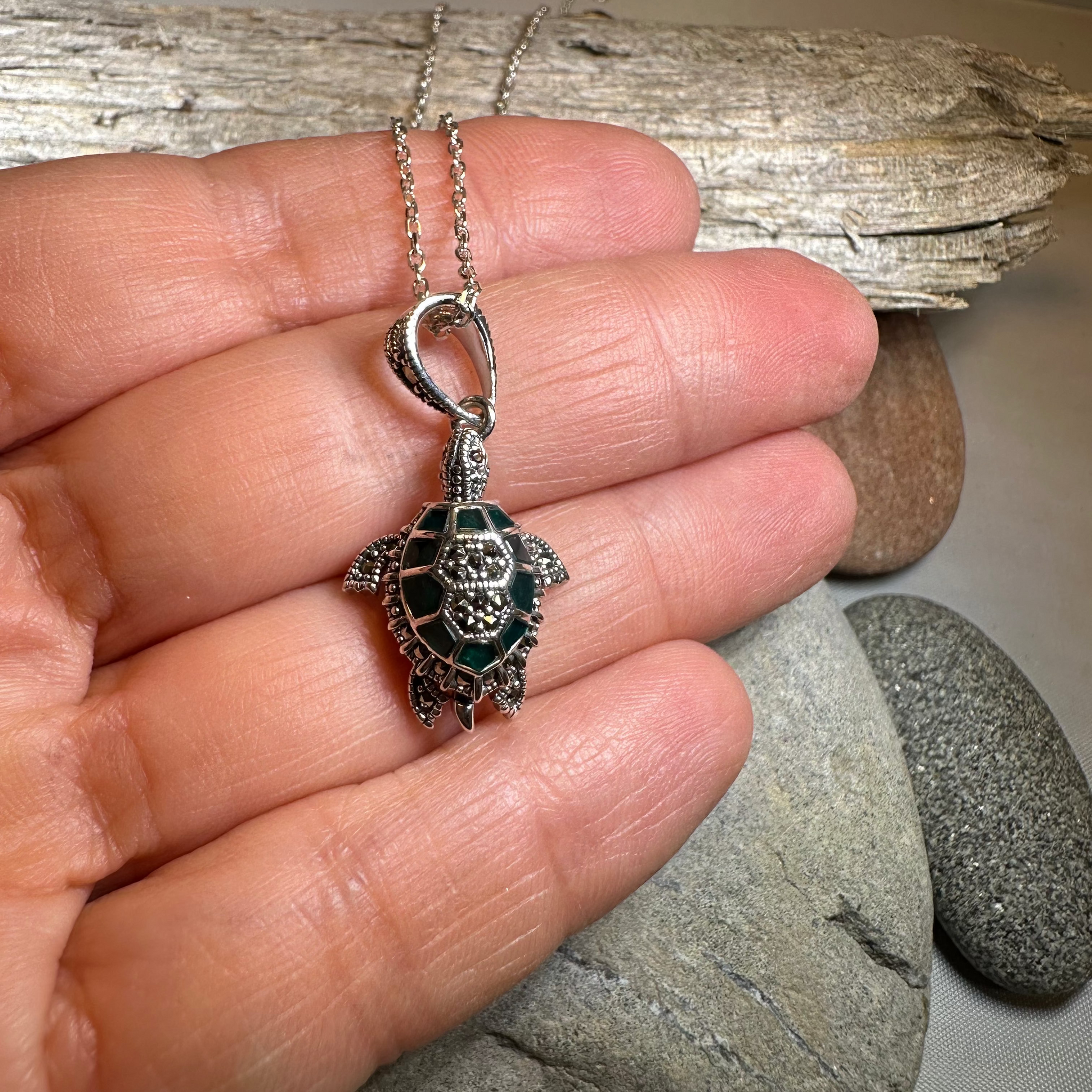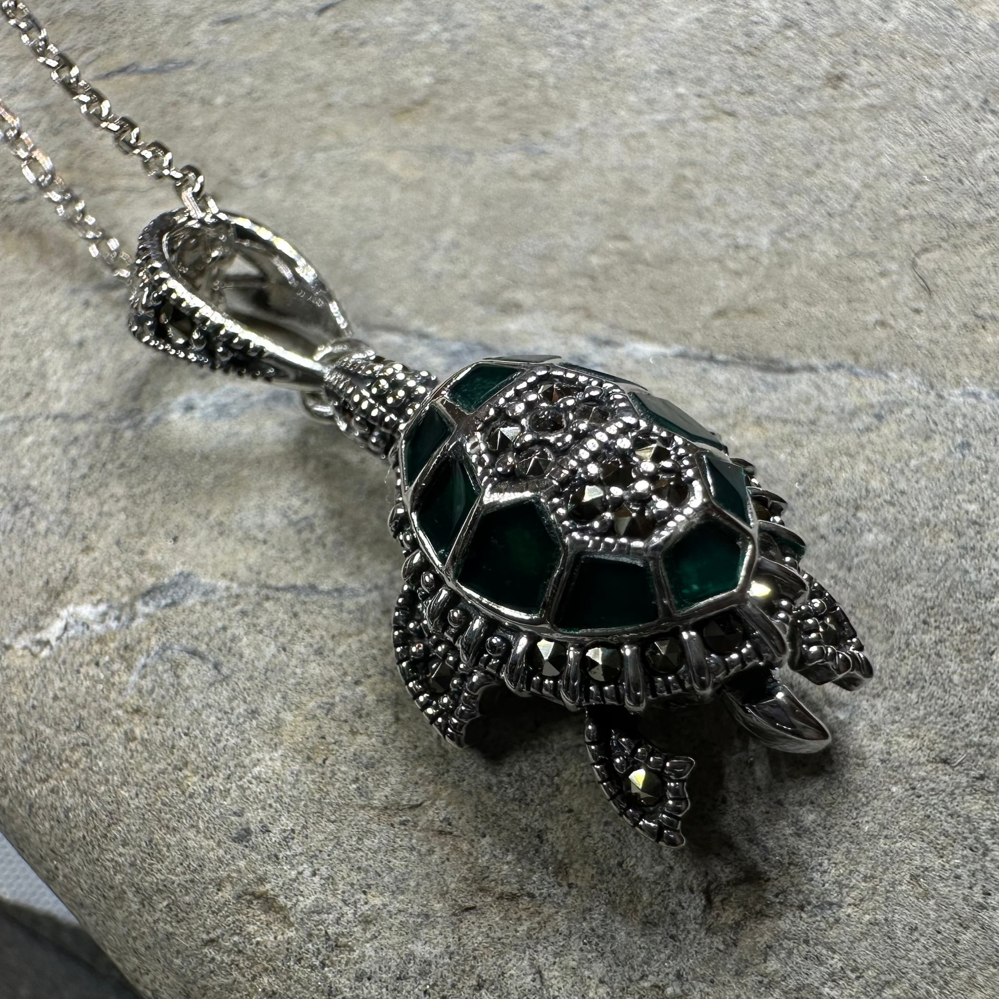 A lovely handmade 3/4" x 1/2" sterling silver turtle with beautiful marcasite gemstones on an 18" sterling silver chain.
