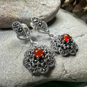 Indulge in the exquisite craftsmanship of these Autumn Blossom Marcasite Earrings. Each earring features a stunning red-orange agate cabochon at its center, adding an element of artistry to the intricate flower design.