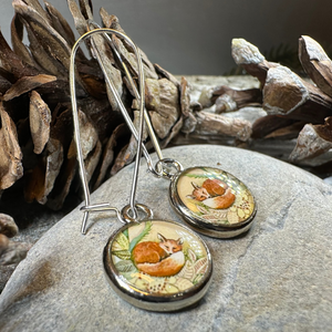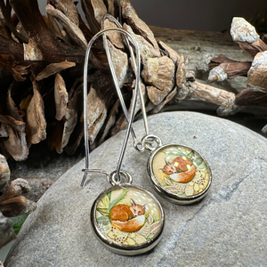 Unique handmade artisan earrings that feature original artwork by an American artist. These earrings are unique and beautiful - the intricate artwork print features a napping fox in a forest.