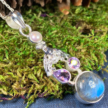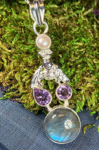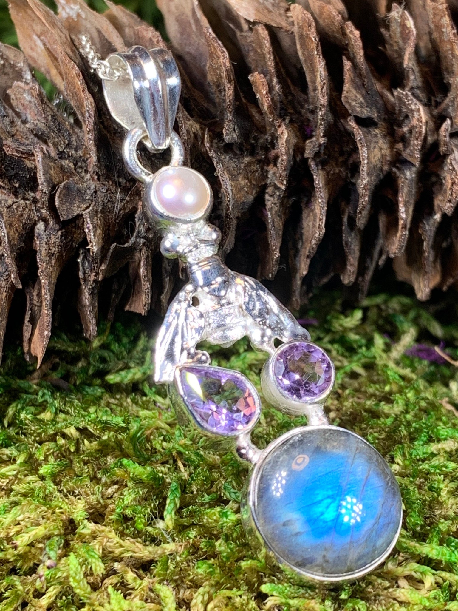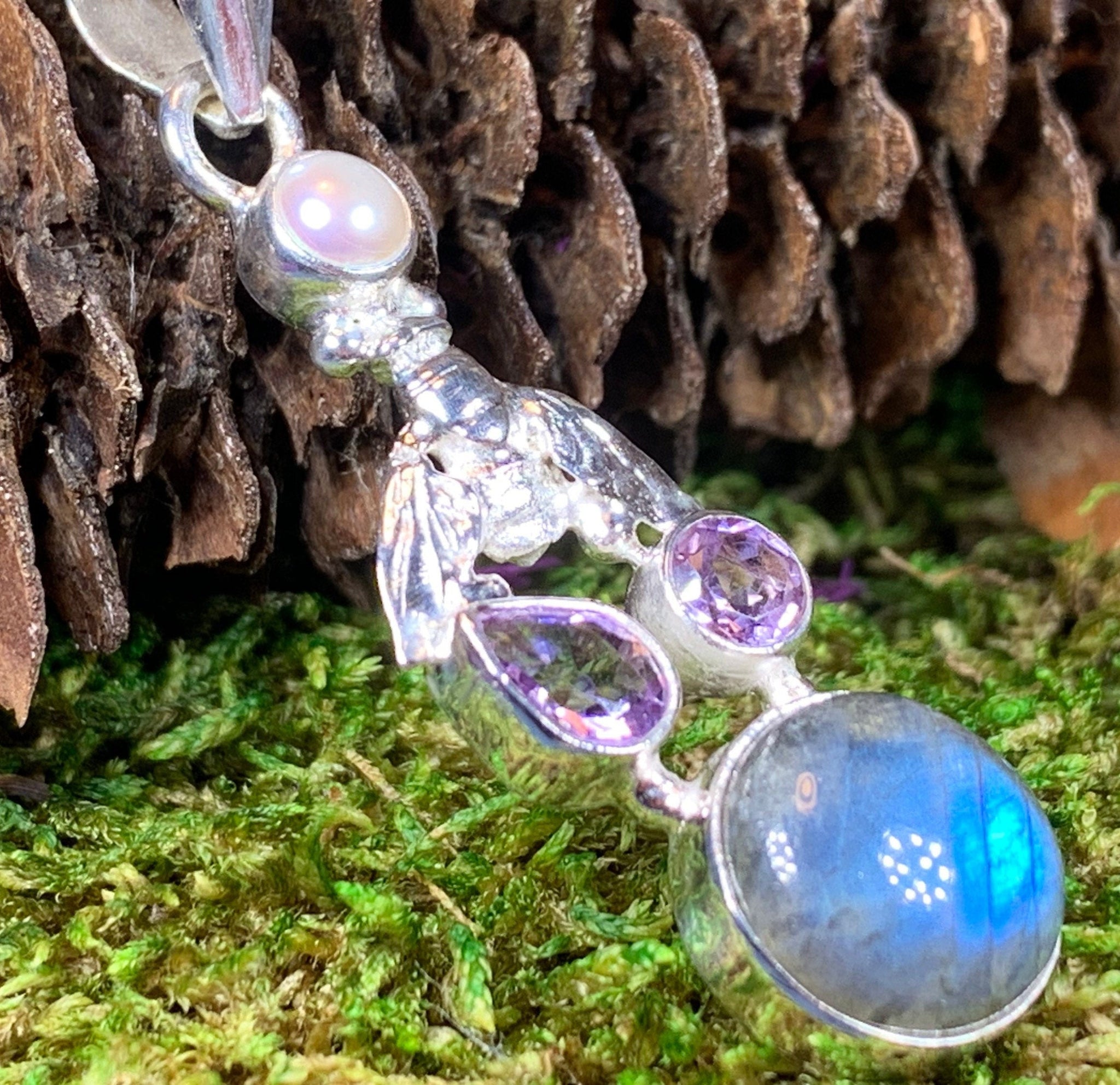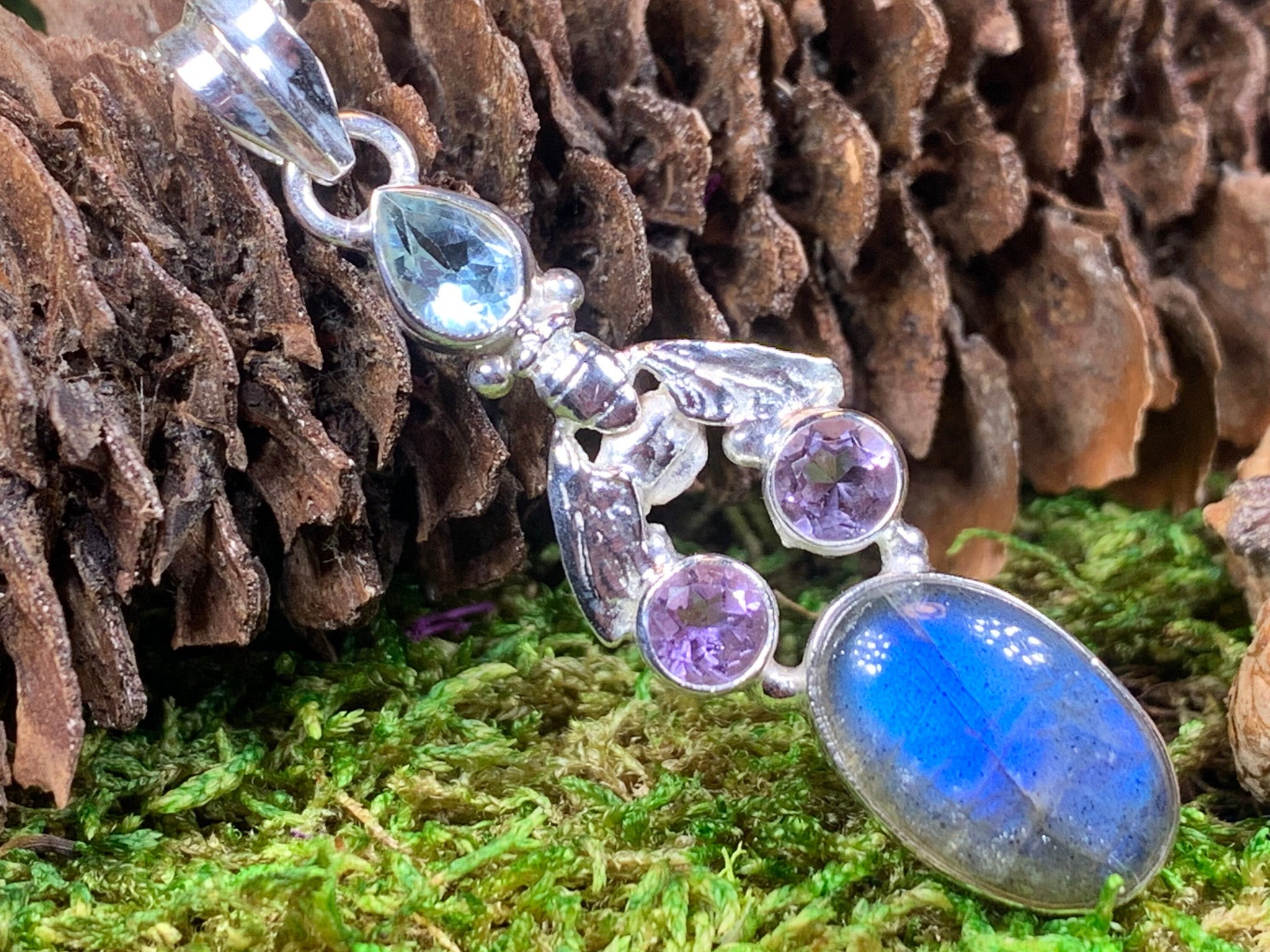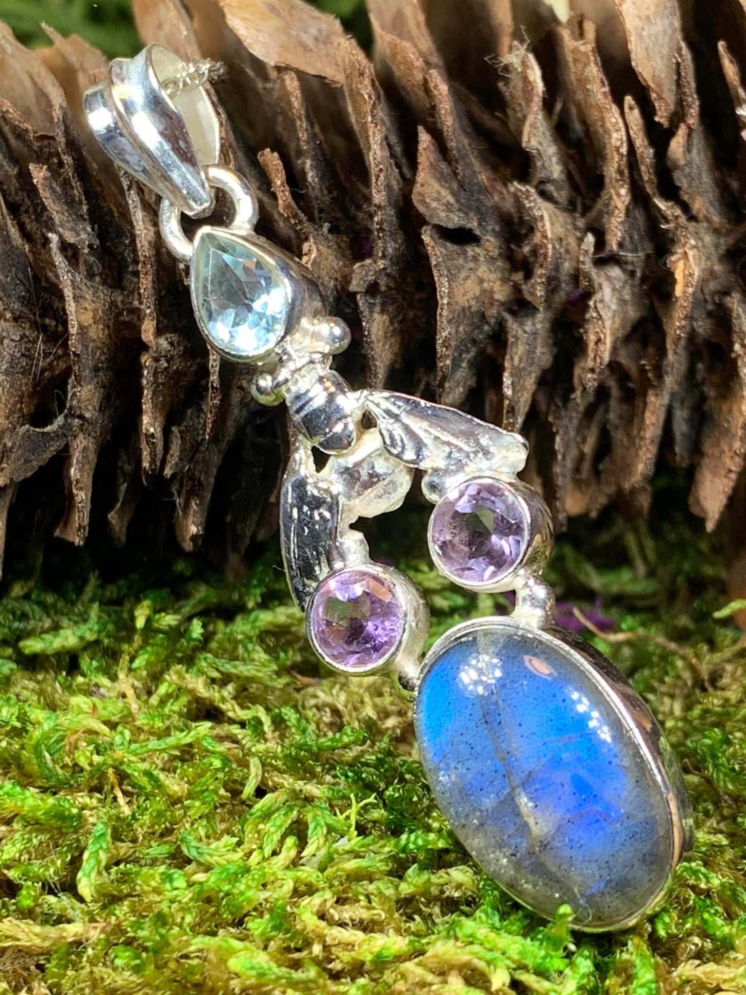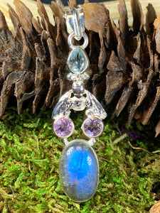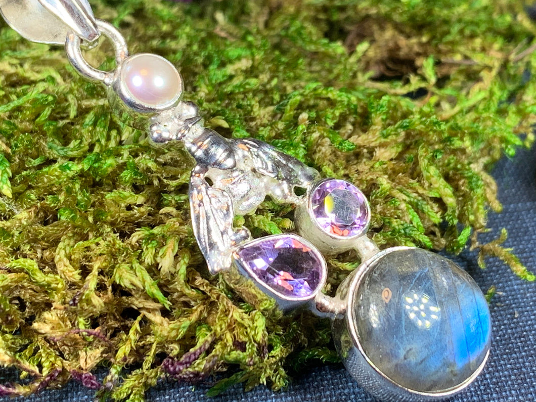 Attractive and detailed Honey Bee gemstone necklace in solid sterling silver on a sterling silver chain. The sterling silver bee is a detailed work of art and sits on top of a glowing blue labradorite stone stone weighing 8 carats and topped with a two natural faceted amethyst stones.