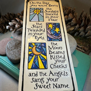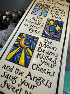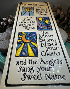The design of this piece is unique because the lettering is etched into the clay rather than just applied to the surface. This gives the piece a dimensional quality that can be appreciated with the hand and the eye! All colors are hand glazed and each piece is kiln fired twice to nearly 2000 degrees. The result is a fade proof work of art that will last a lifetime indoors or outdoors.
