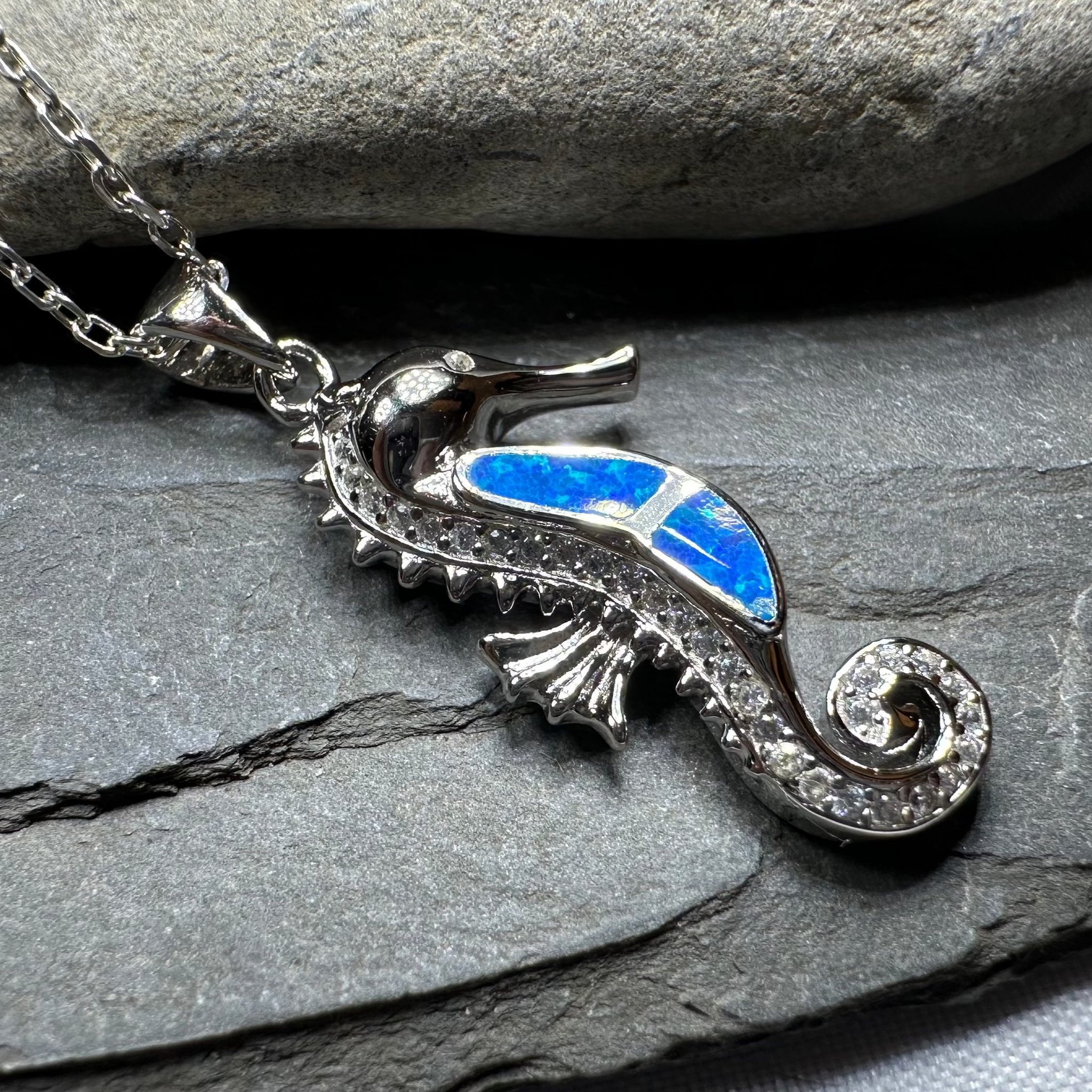 1" x 1/2" solid sterling silver with lab created blue opal inlay on an 18" chain.