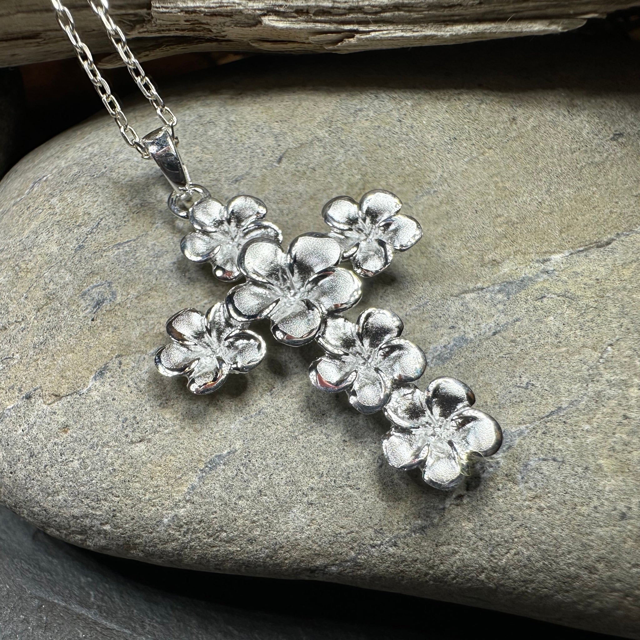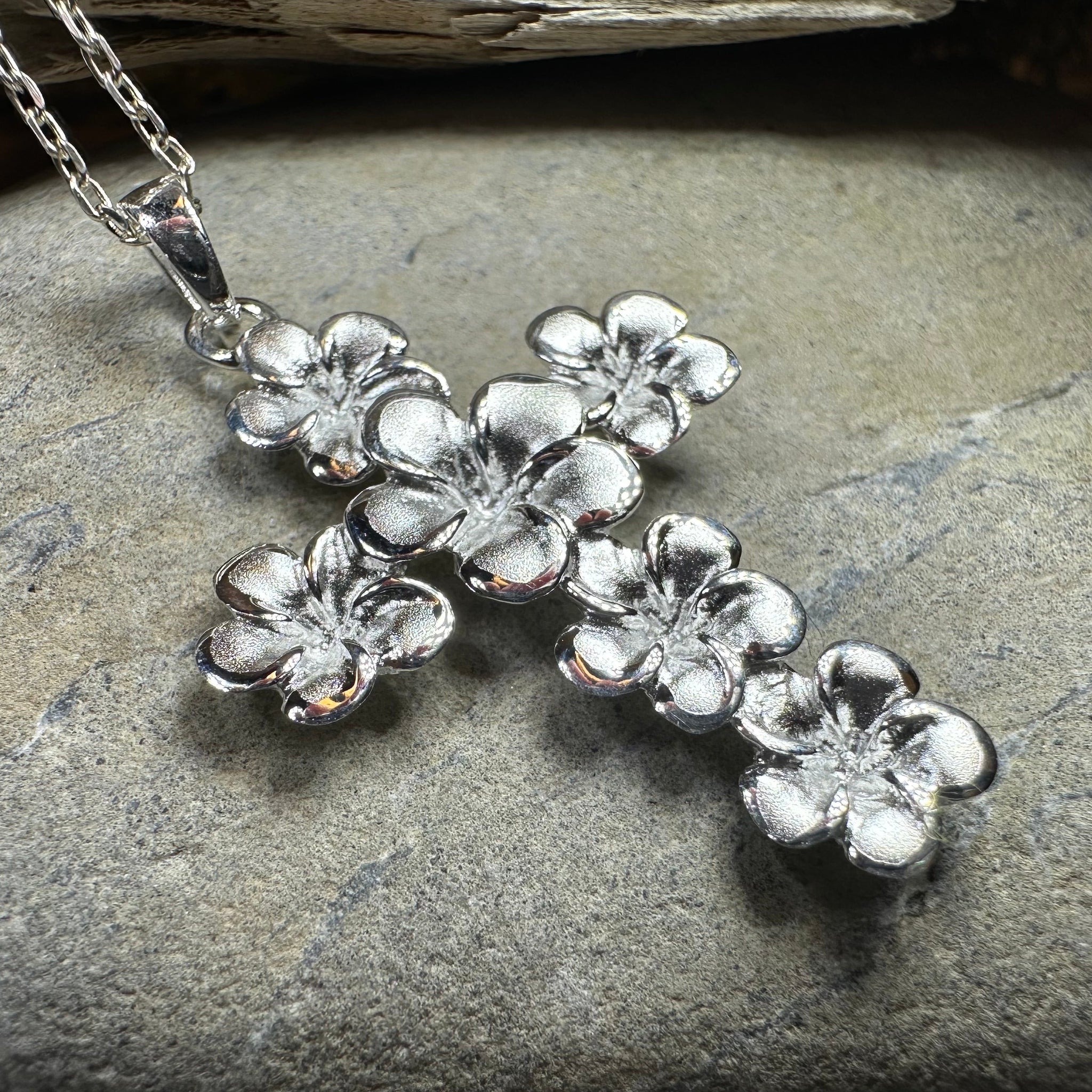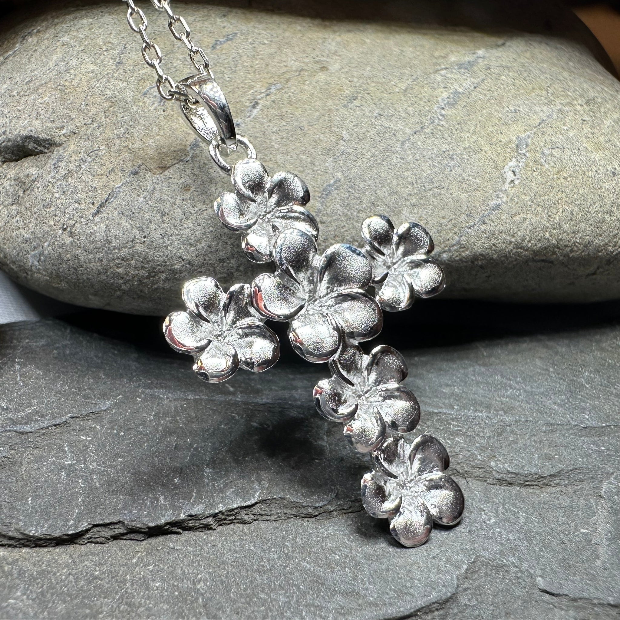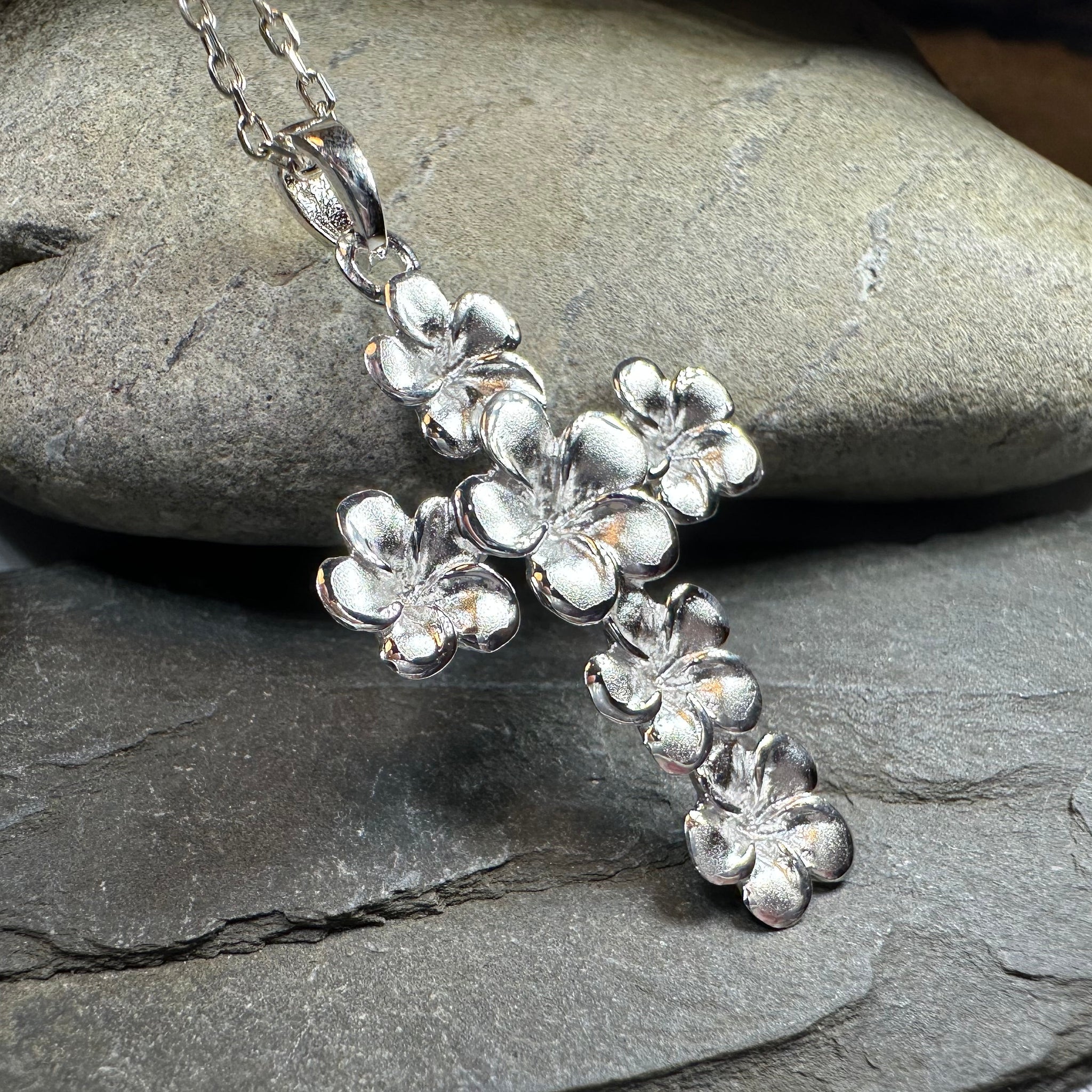 Discover the serene elegance of our Blossom Cross Necklace, where timeless spiritual symbolism meets botanical artistry. This exquisite piece features a graceful cross adorned with intricately detailed plumeria blossoms in full bloom, each petal captured with remarkable precision.