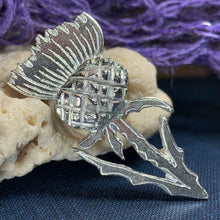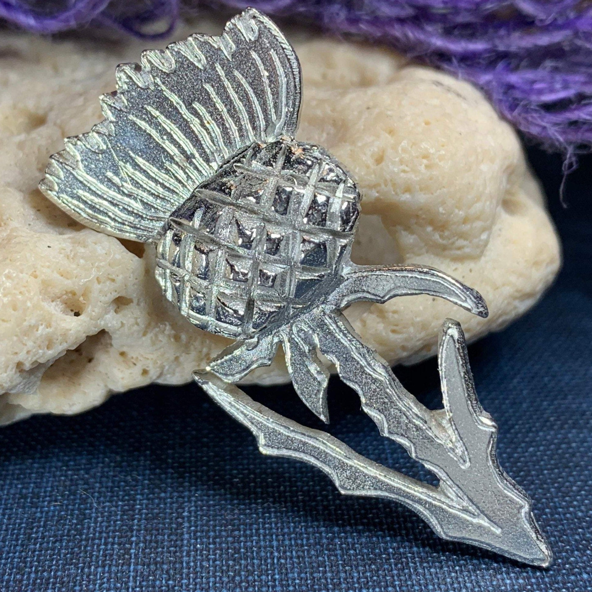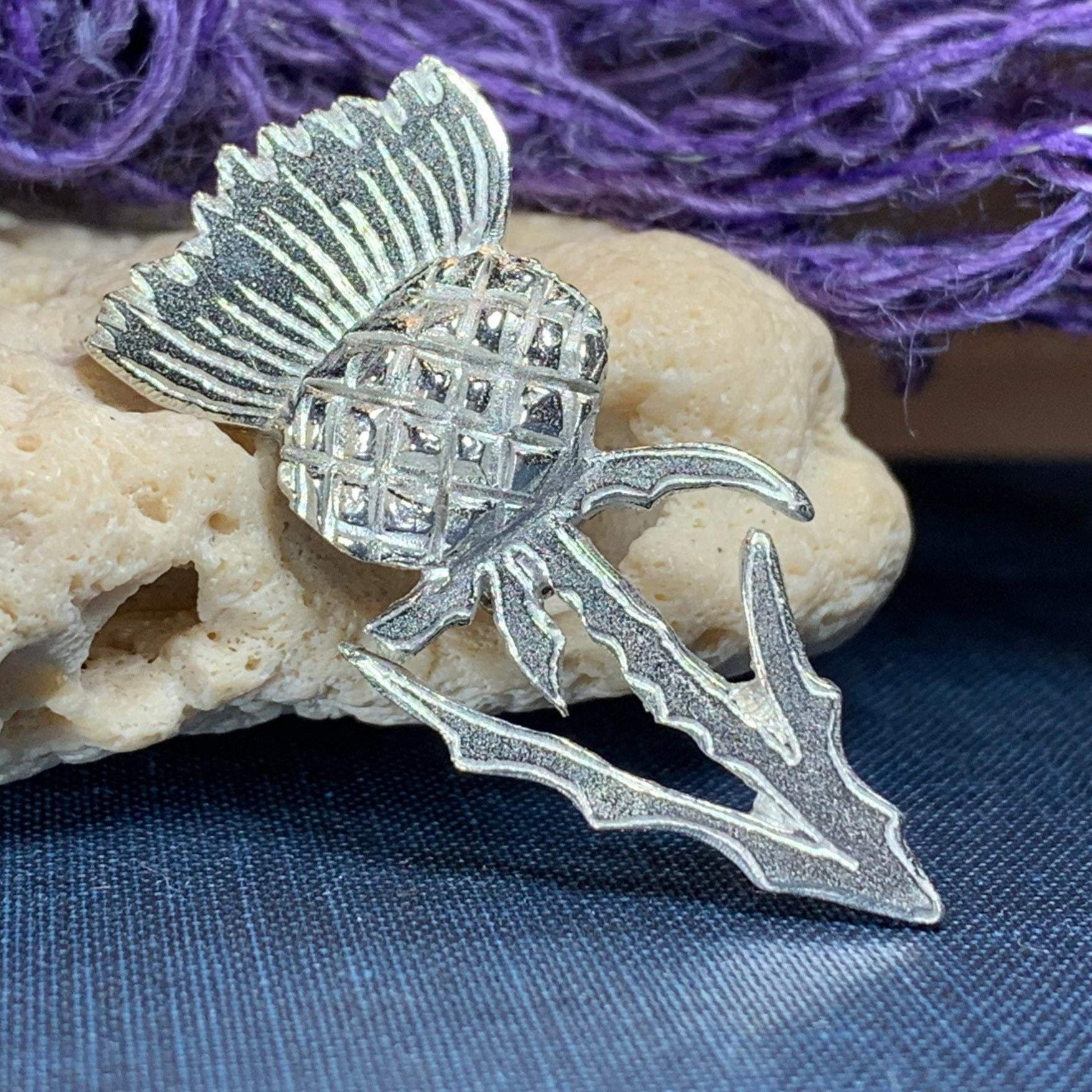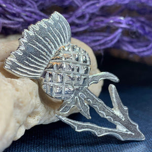 Legend has it that the Norsemen attempted to surprise the Scots with a night attack. Taking off their footwear to ensure silence, they traveled across the thistle covered land. The resulting cries alarmed the Scots enabling them to drive off the Norse. Throughout Celtic regions, thistle represents bravery, devotion, durability, strength, and determination celebrated in this pewter pin.
