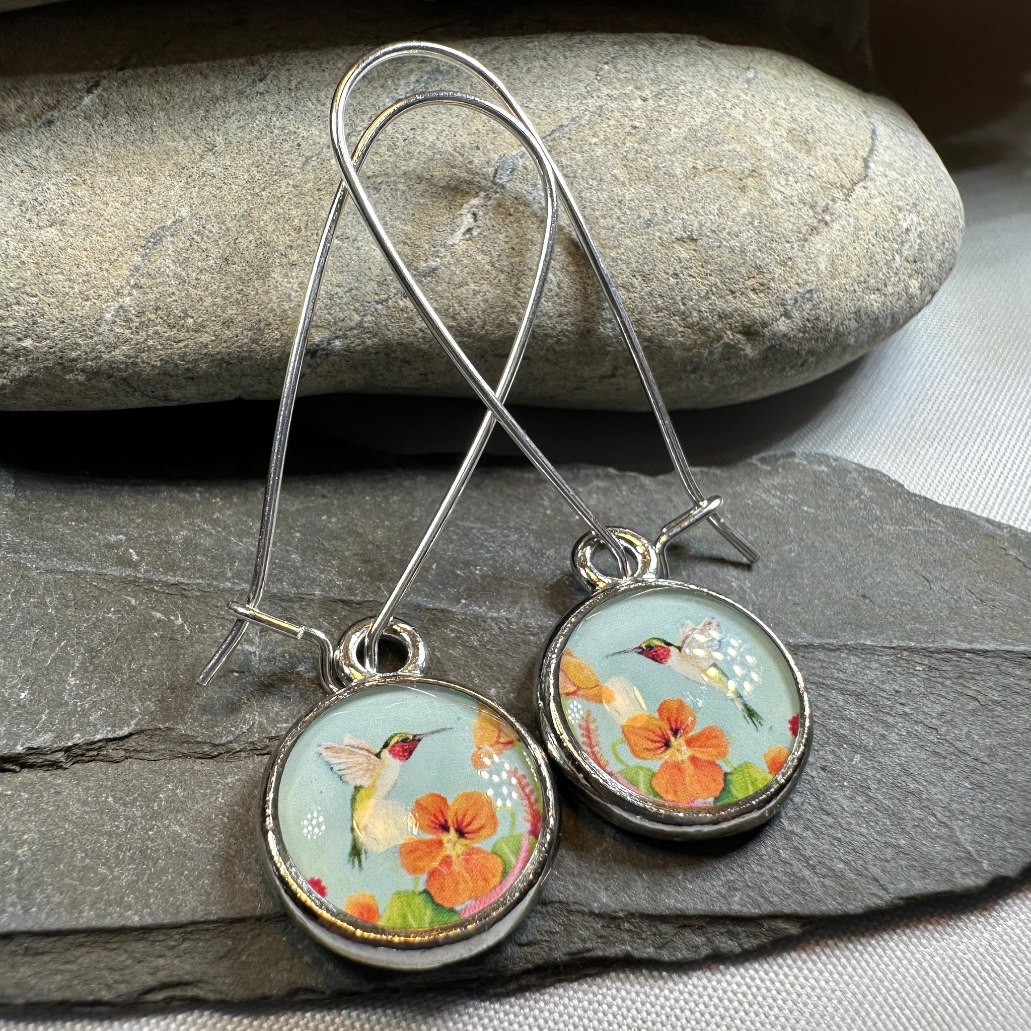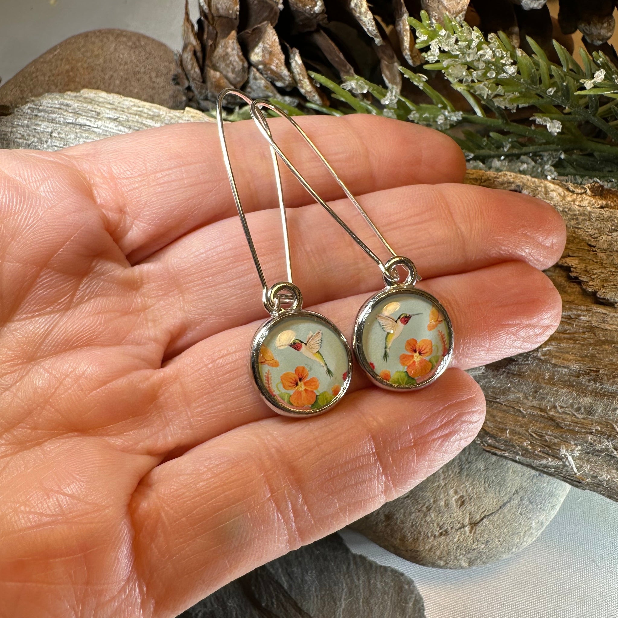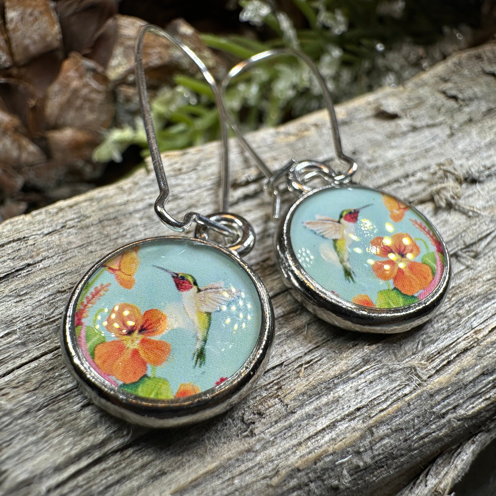 Unique handmade artisan earrings that feature original artwork by an American artist. These earrings are unique and beautiful - the intricate artwork print features a summer hummingbird and a tropical flower.