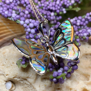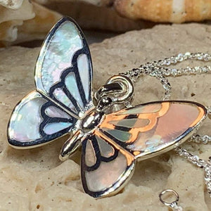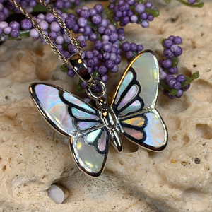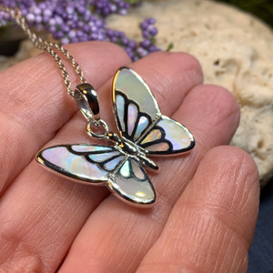 Carefully crafted from fine pure silver with natural abalone shell or mother of pearl inlay - this necklace captures the beauty of the butterfly and adds a bit of grace and interest to all it touches.