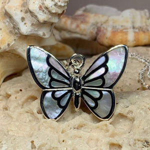 Solid Sterling Silver Butterfly Pendant with natural shell inlay.
