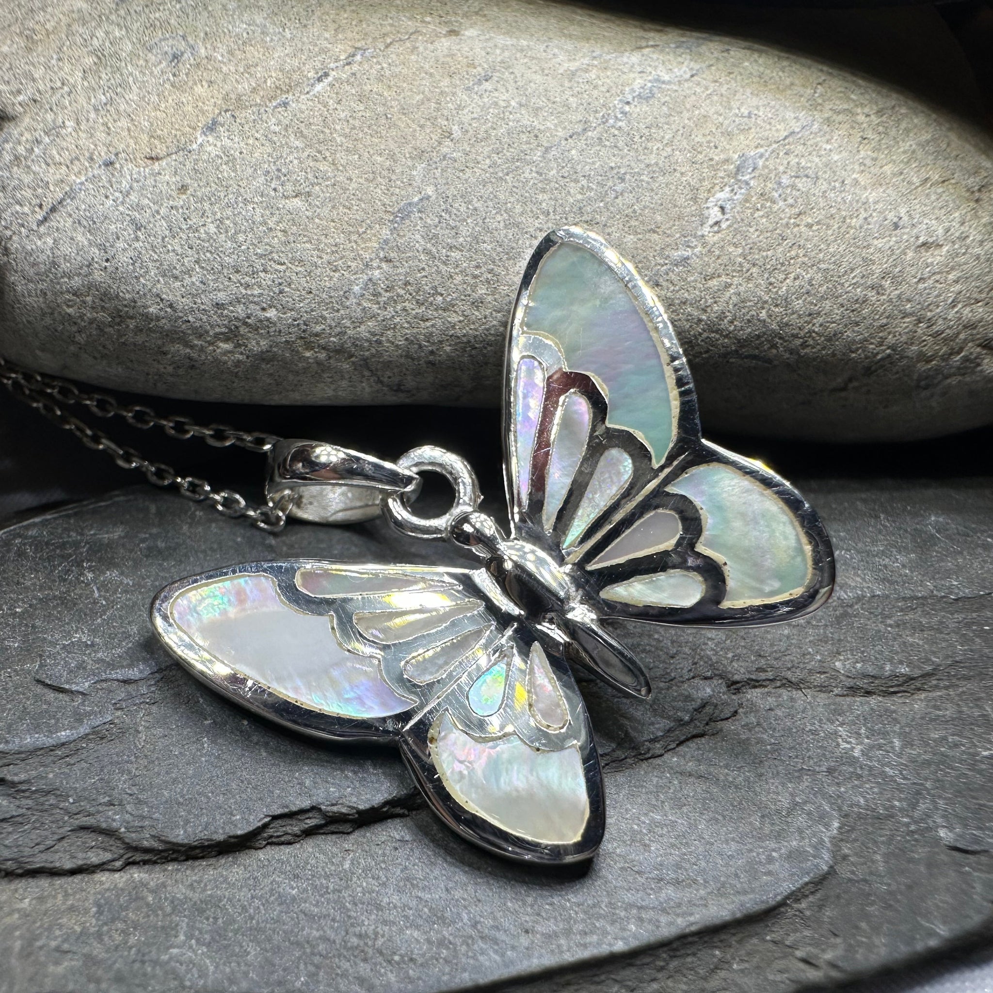 Solid Sterling Silver Butterfly Pendant with natural shell inlay.