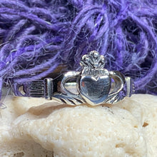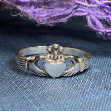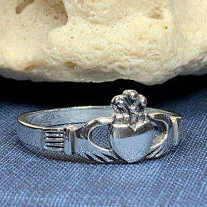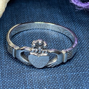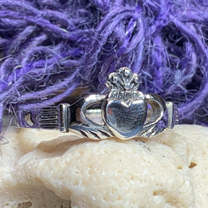 A unique design combining the traditional elements of the claddagh with Celtic knot work - solid sterling silver. This beautiful claddagh ring features trinity knots on the sleeves of the hands!