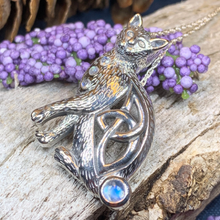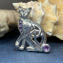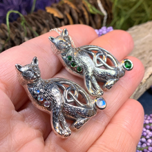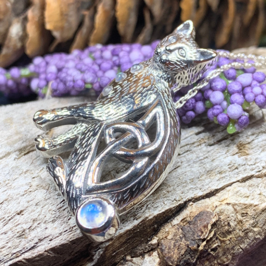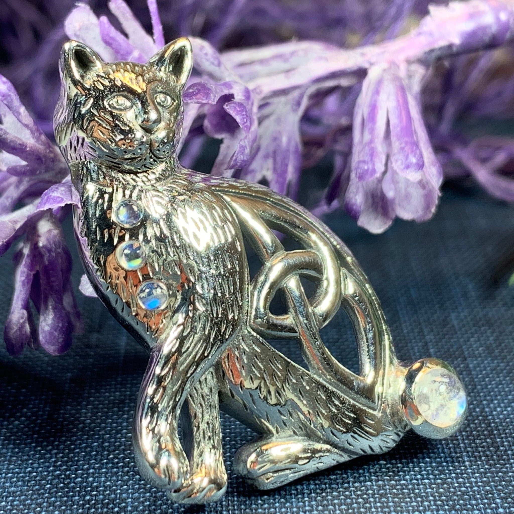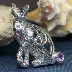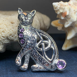 This beautiful Celtic Cat adorned with four rainbow moonstones, emerald cubic zirconia or faceted amethyst stones will be the perfect gift for any lover of cats or Celtic culture.