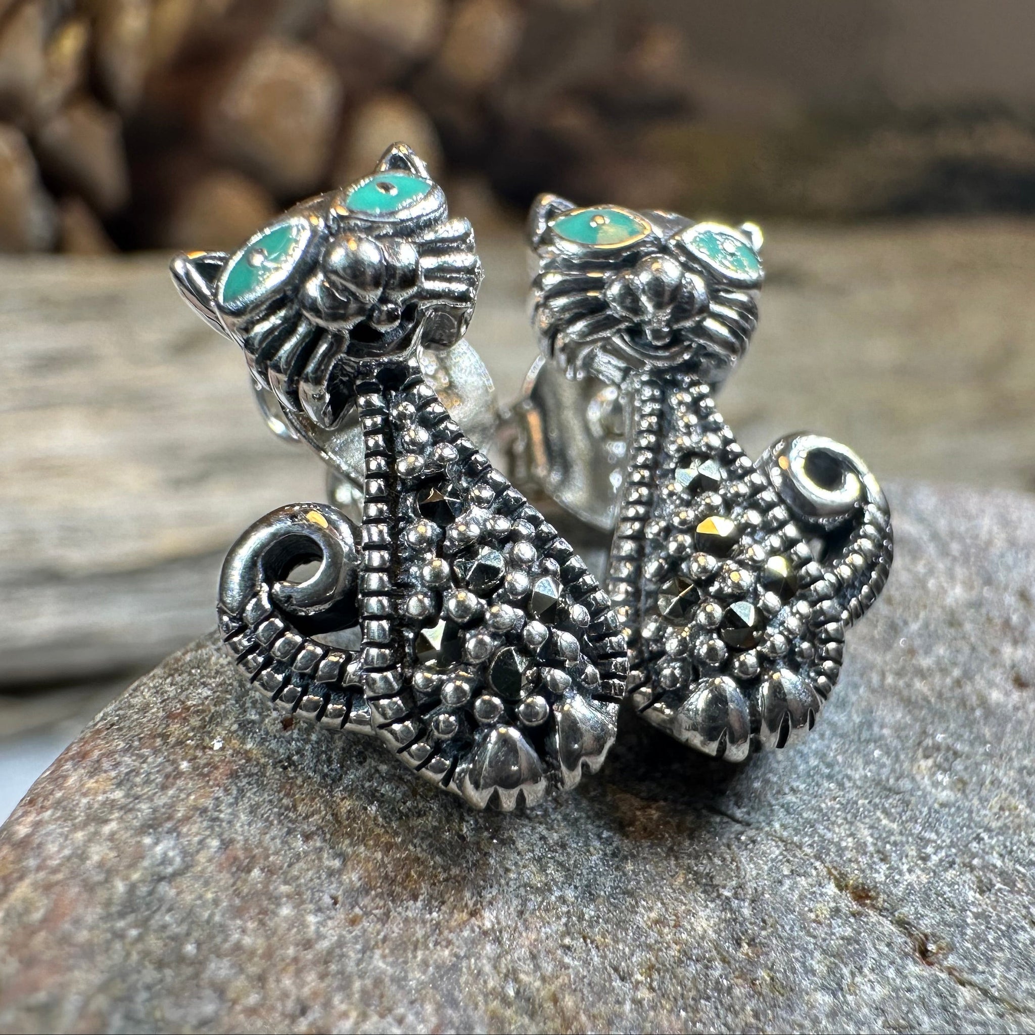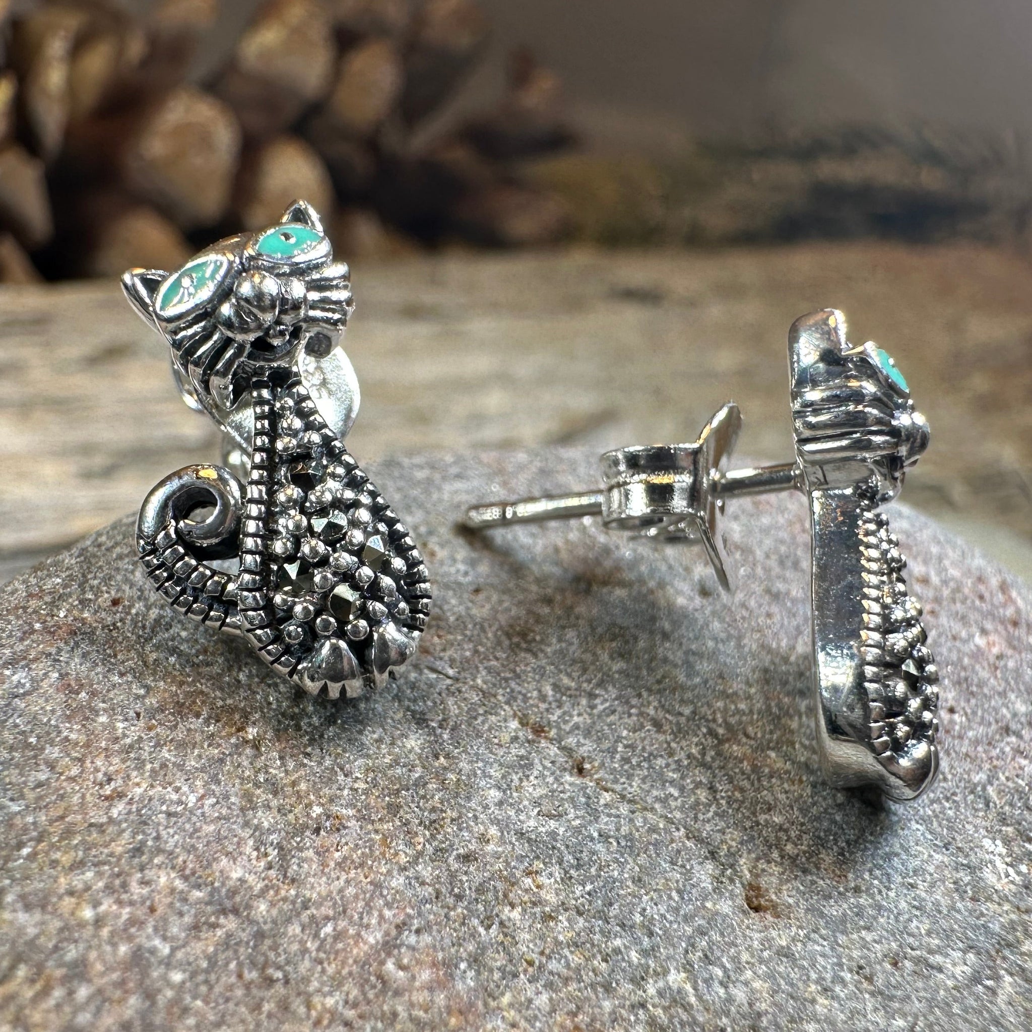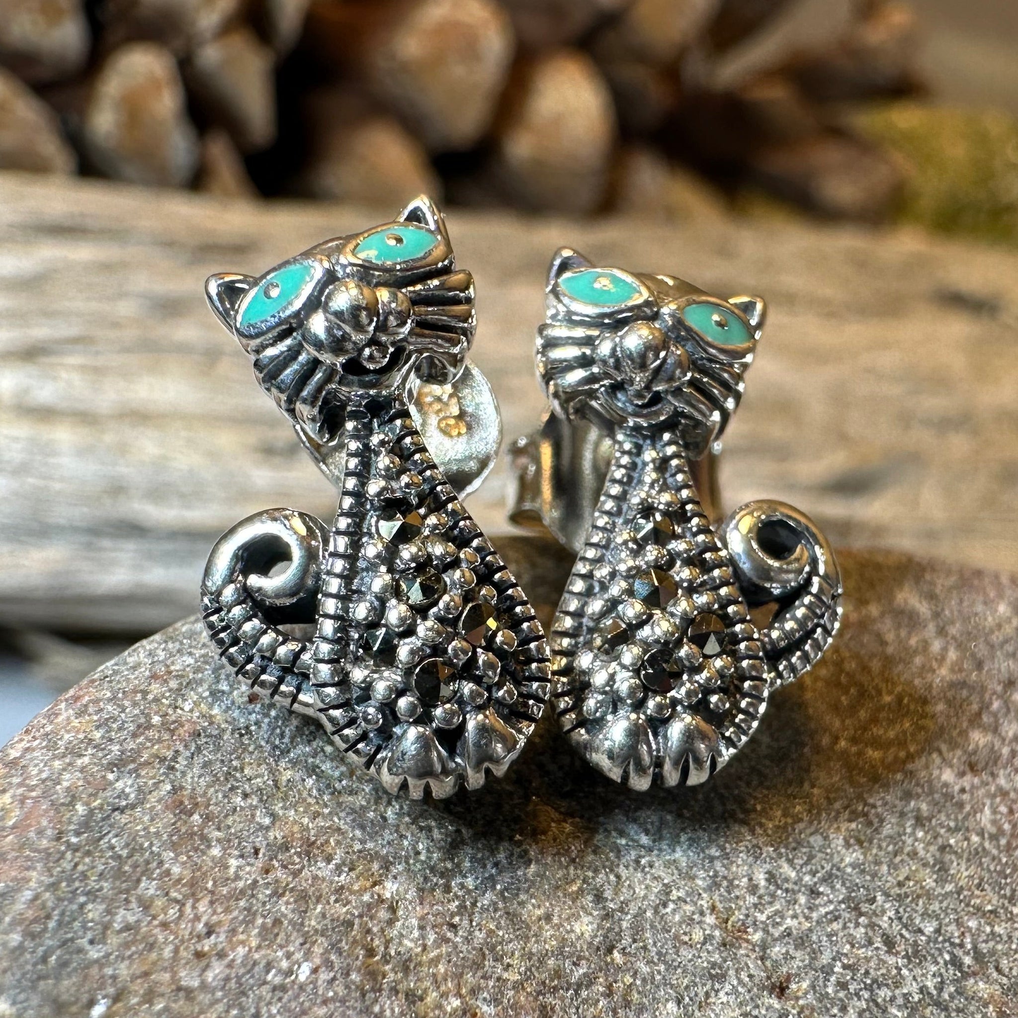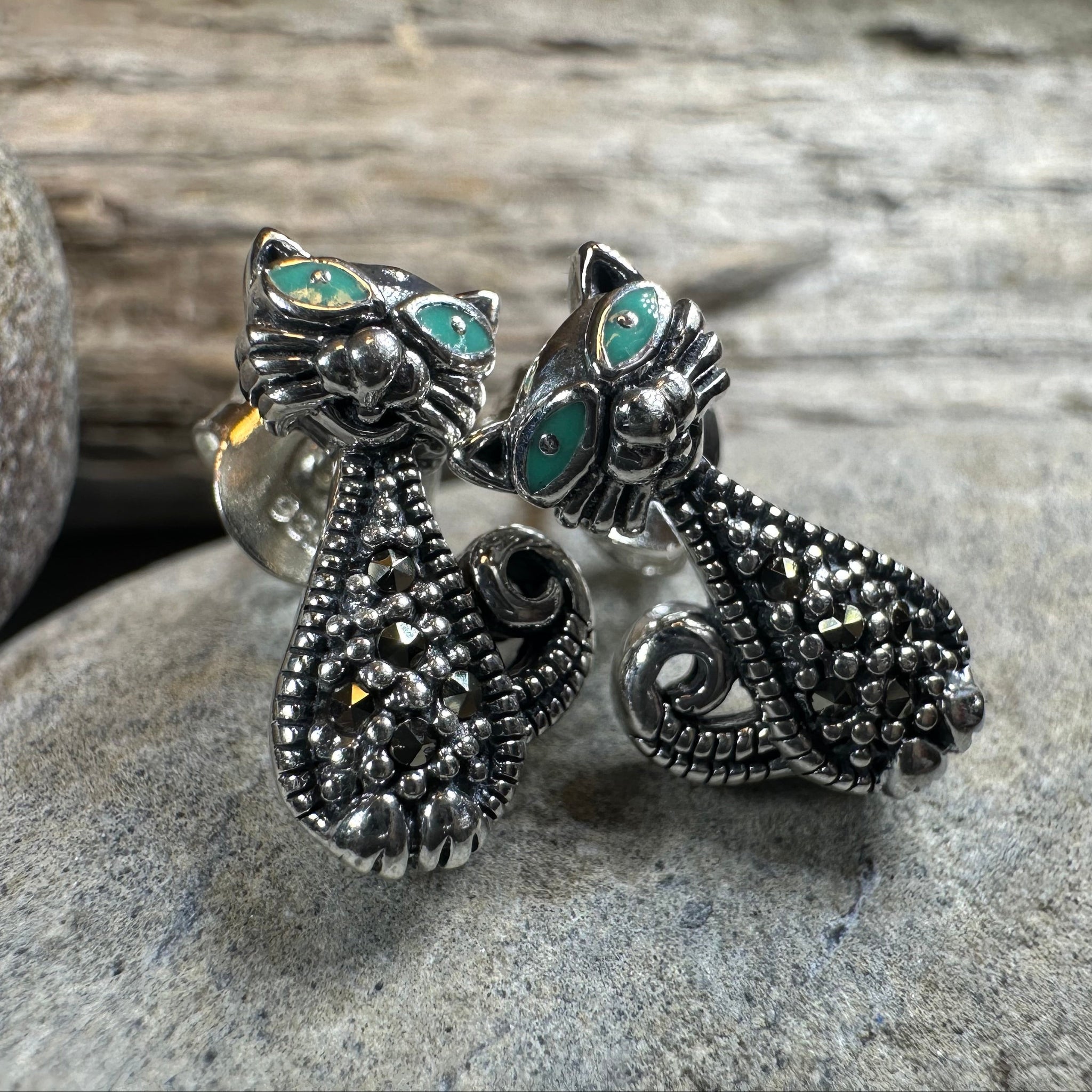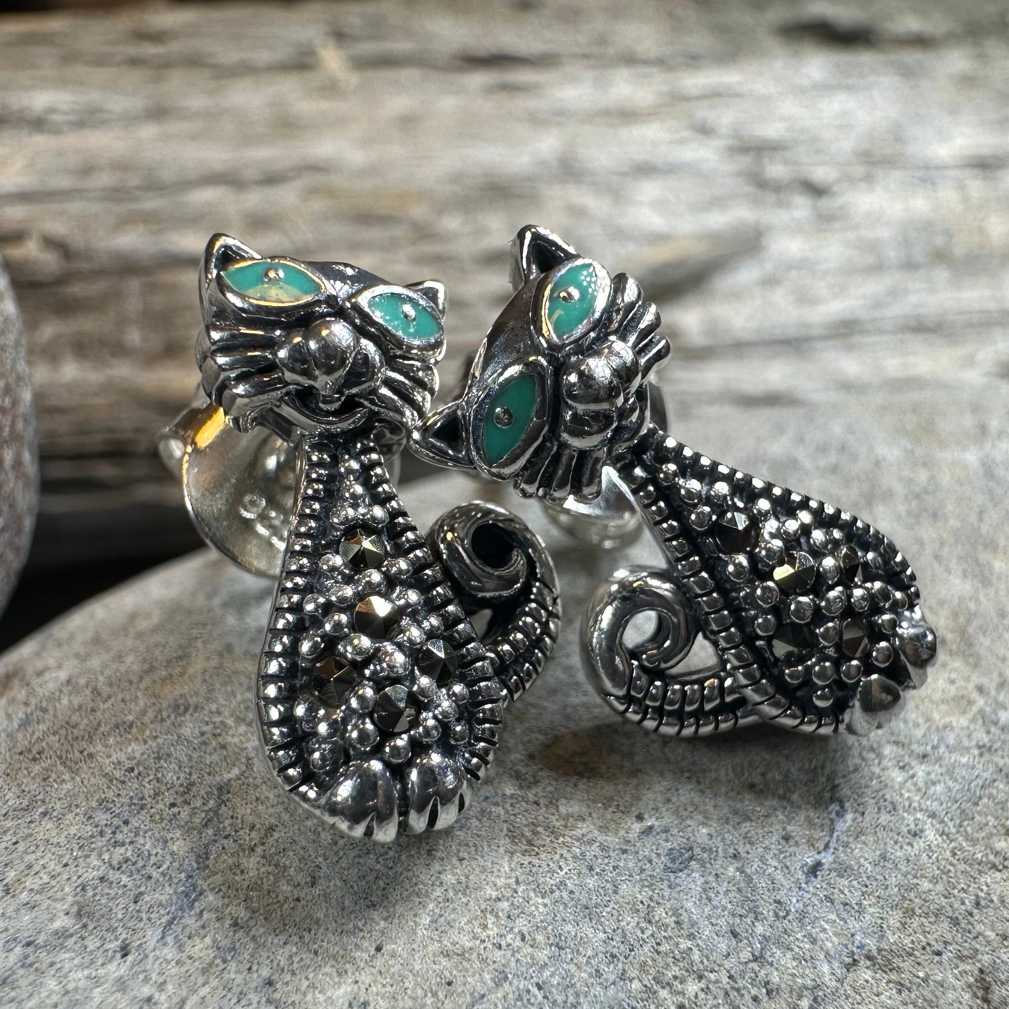 These beautifully detailed cat stud earrings are made of sterling silver with sparkling marcasite. The turquoise enamel eyes really make these sweet earrings stand out!