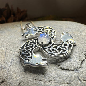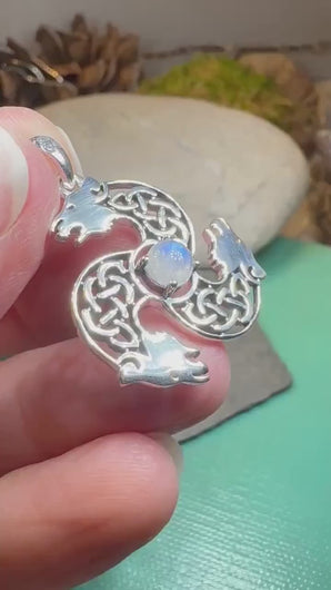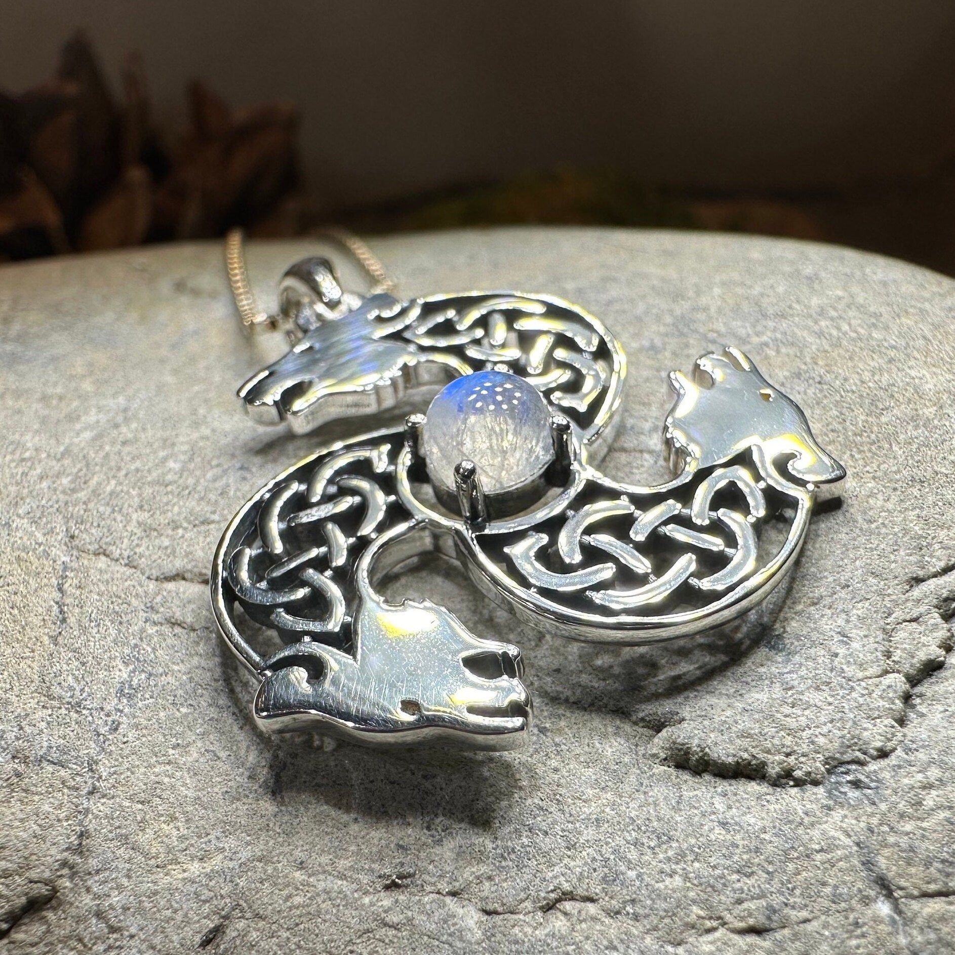 Solid Sterling Silver Celtic Bear Triple Spiral Pendant with authentic rainbow moonstone gemstone on an 18" chain.