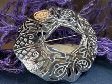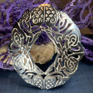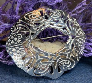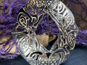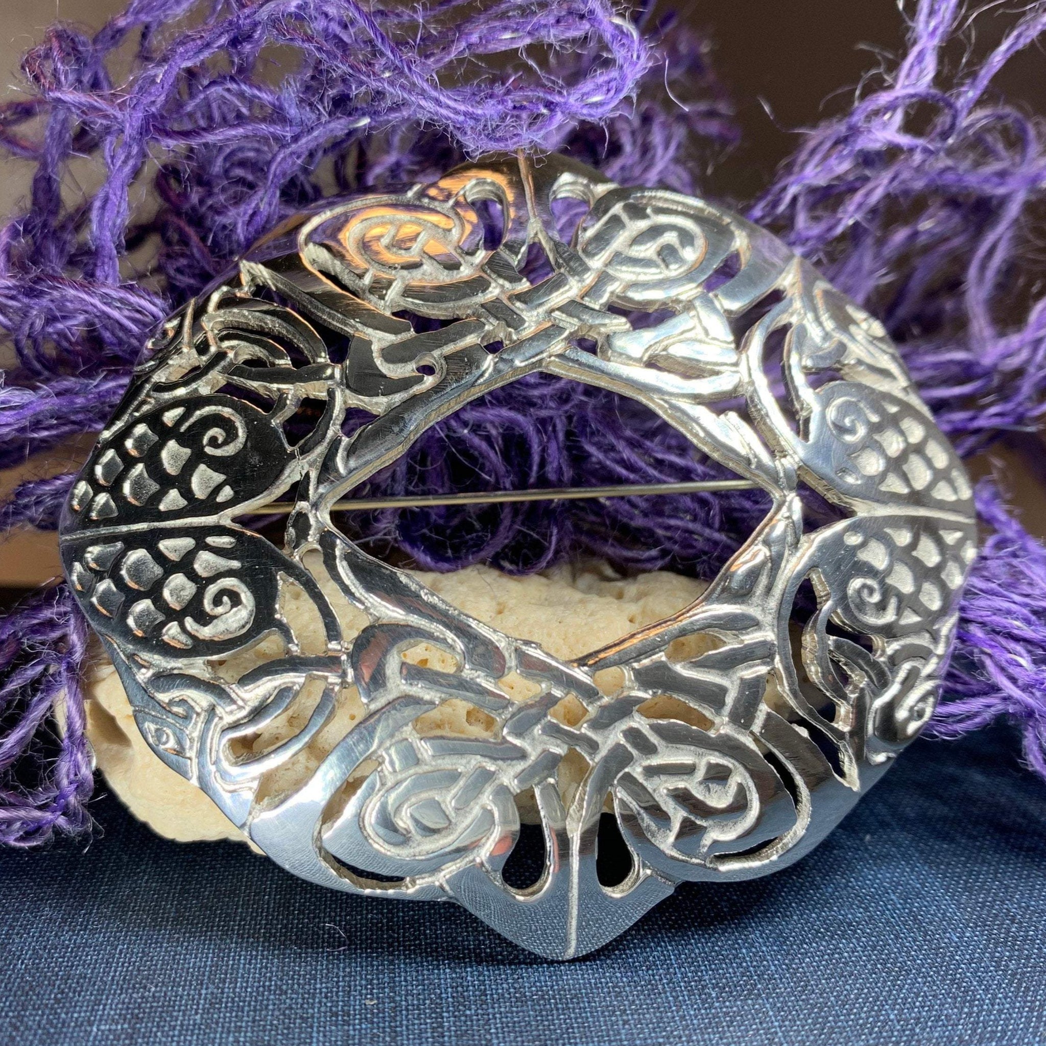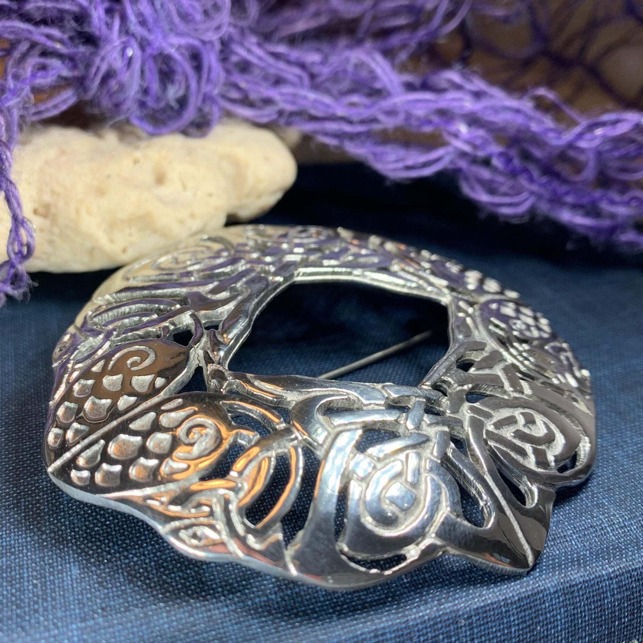 Polished pewter with intricate Celtic knotwork and traditional Celtic zoomorphic (animal and bird) design. A beautiful pin that will get attention and become your favorite go-to piece for a rich Celtic look!