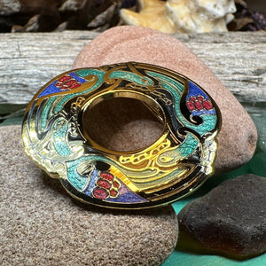 This beautifully detailed gold-tone brooch shows every bit of this elegant Celtic birds - surrounded with Celtic knotwork and completed with lovely richly colored enamel.