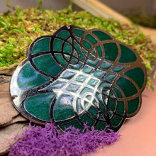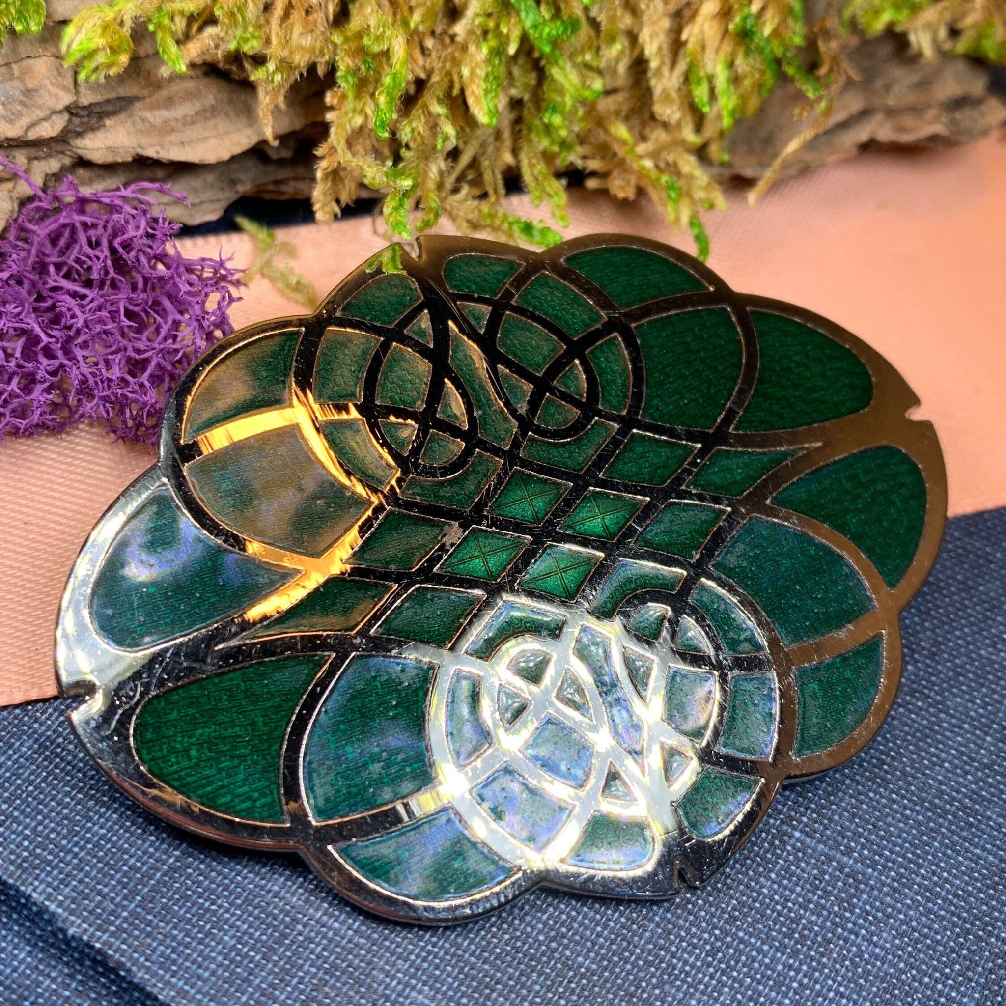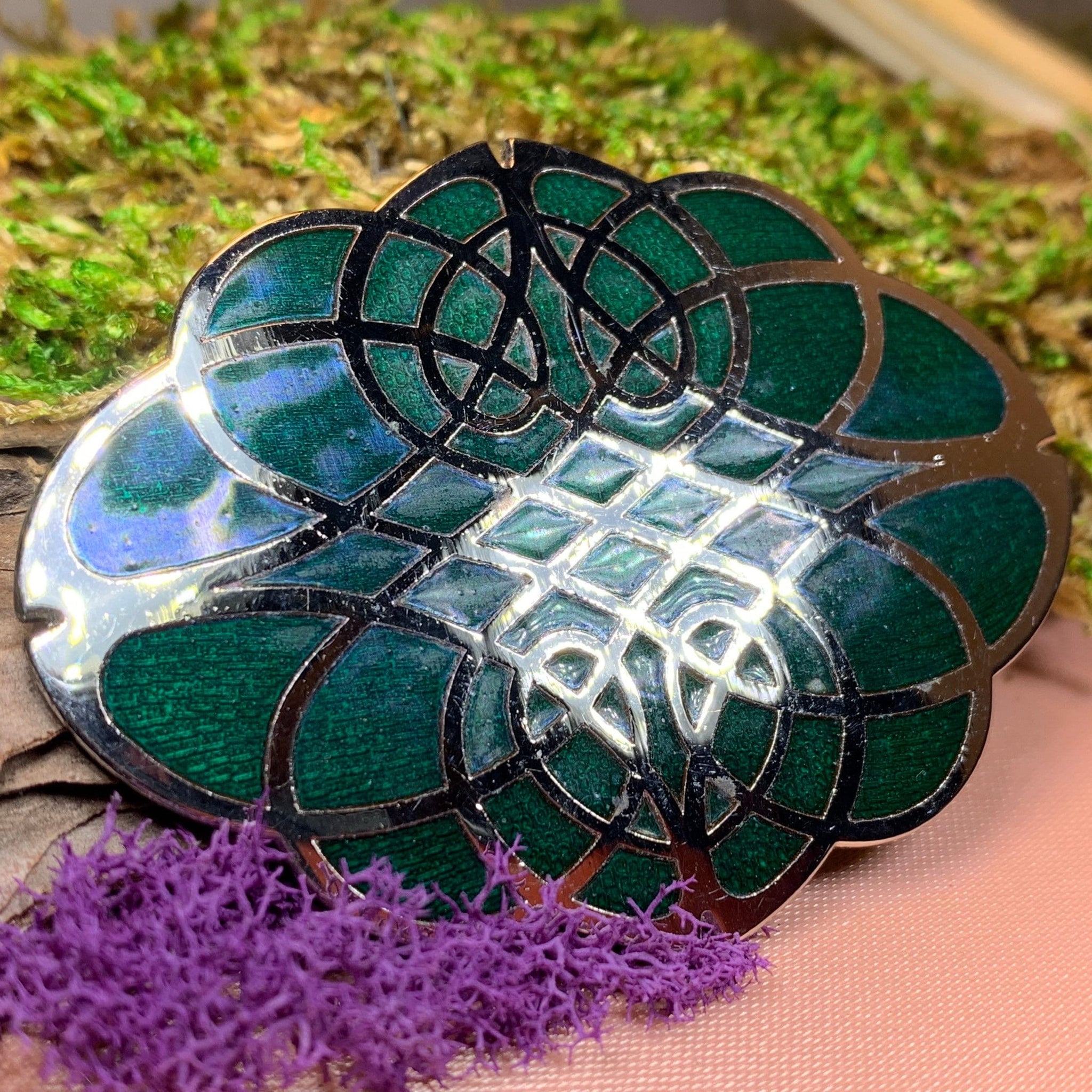 Silver-tone over pewter Celtic Knot style brooch in green enamel.