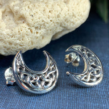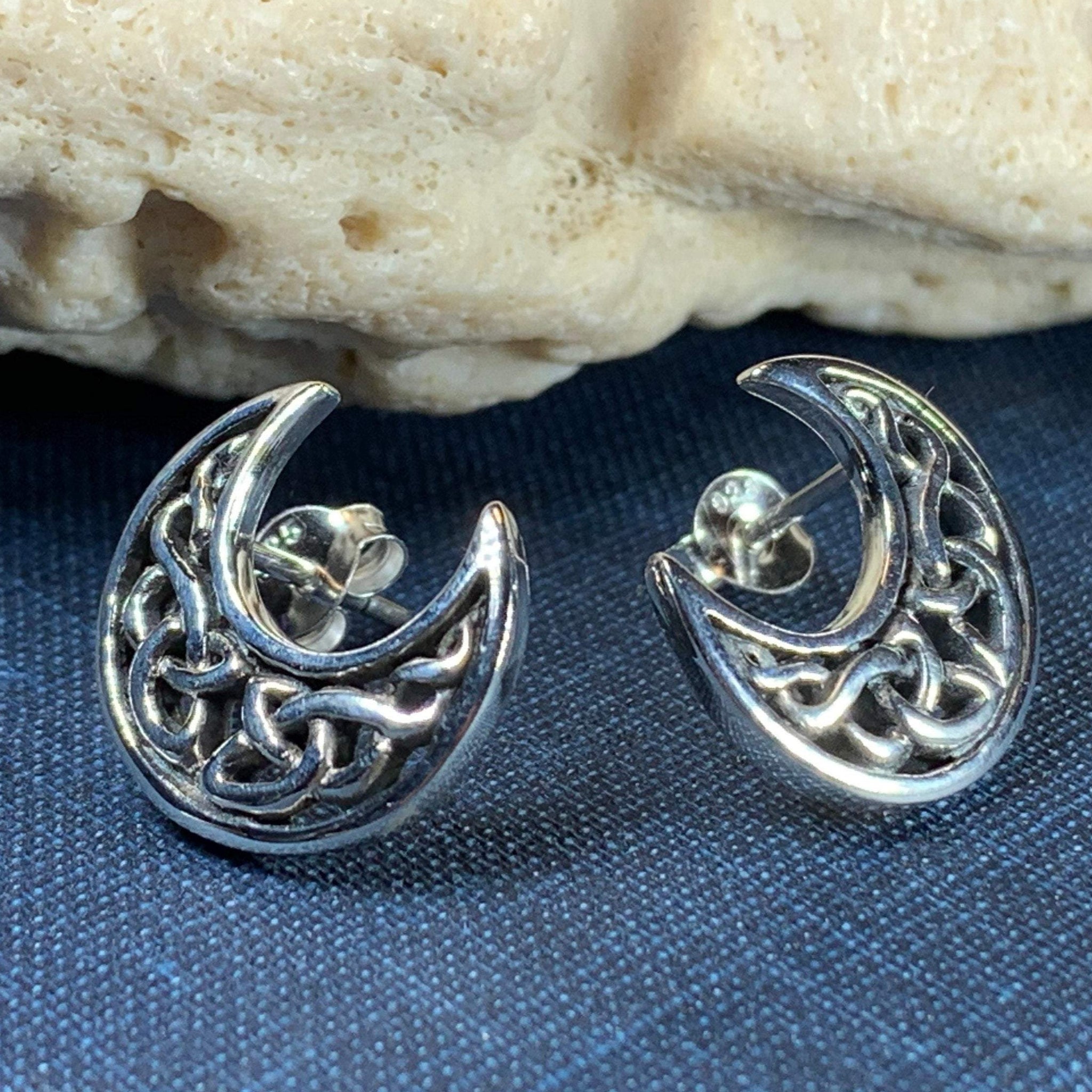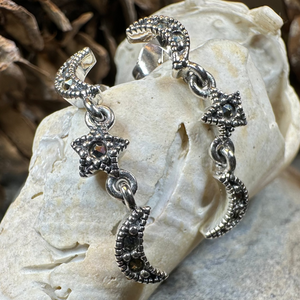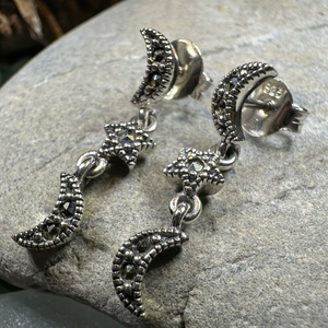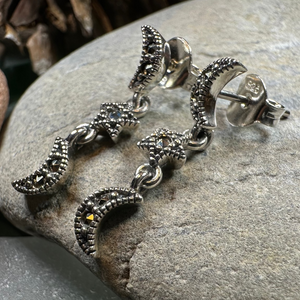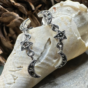 Attractive and detailed long dangle of moons and stars in a stud earring that features a classic design and sparkling marcasite gemstones. Solid sterling silver with a push back closure.