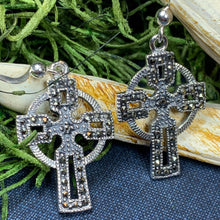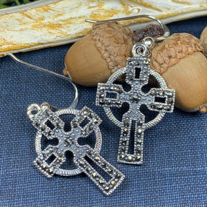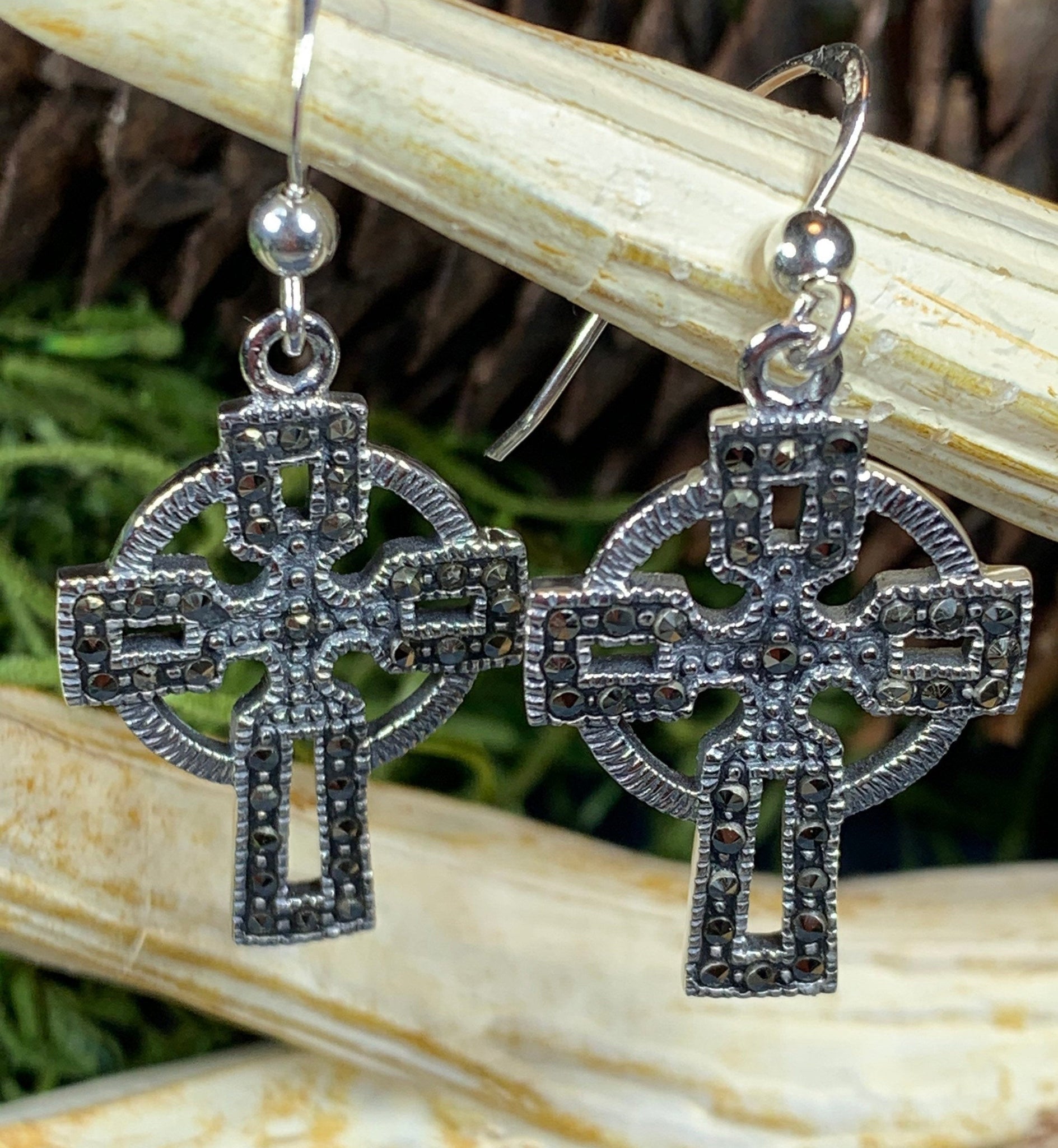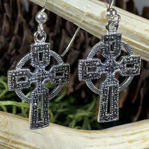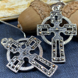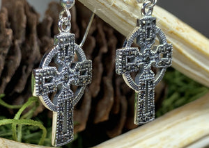 A highly attractive pair of Celtic Cross Sterling Silver Earrings, featuring a design based on traditional stone carved Celtic Crosses.