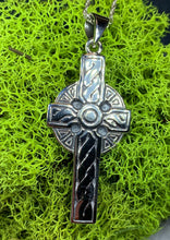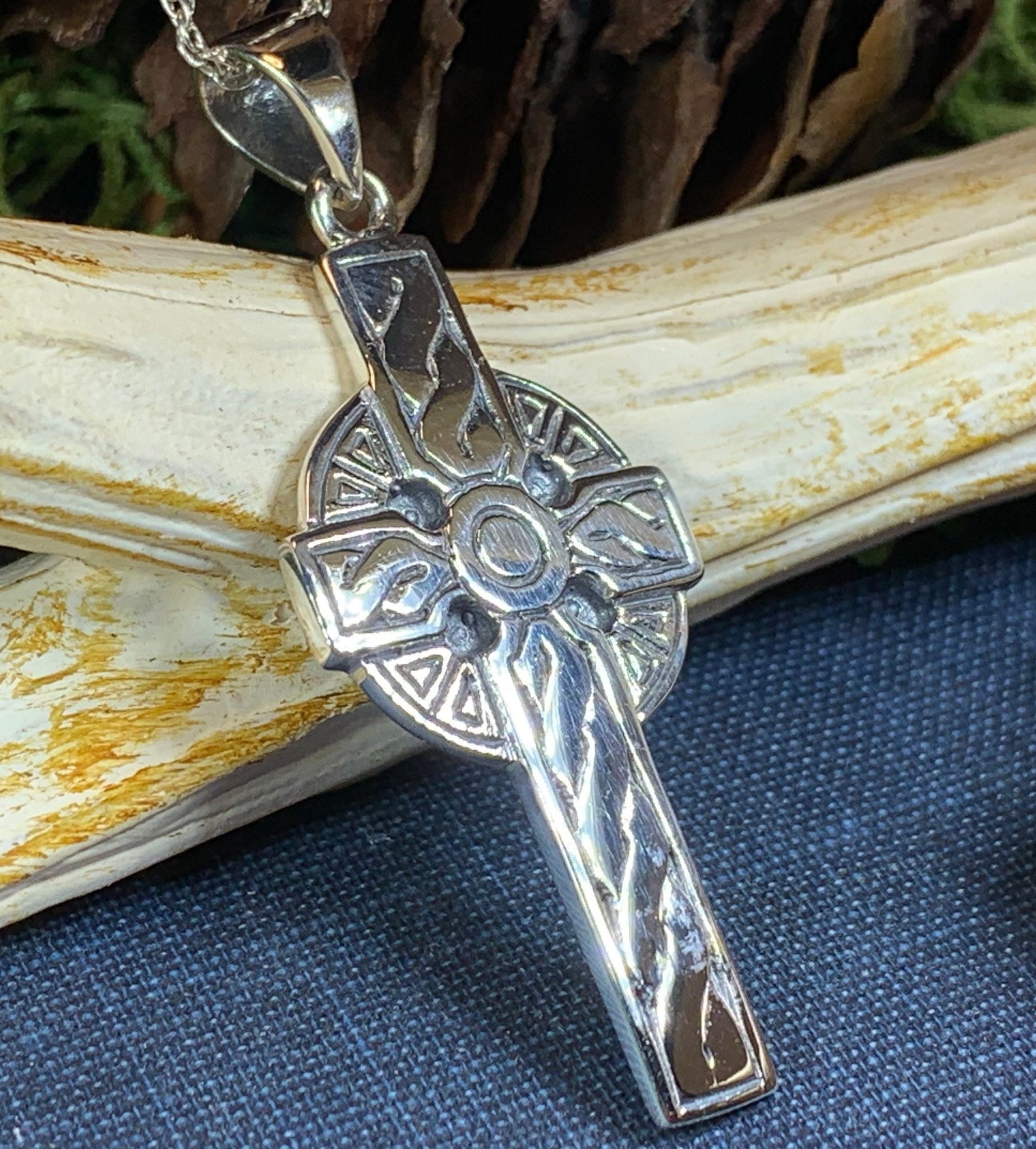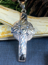 This knot work cross pendant is cast in sterling silver and has an intricate design reminiscent of classic Celtic crucifixes. Makes a beautiful gift.