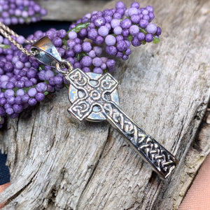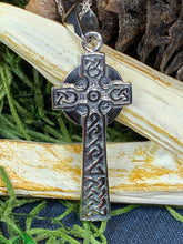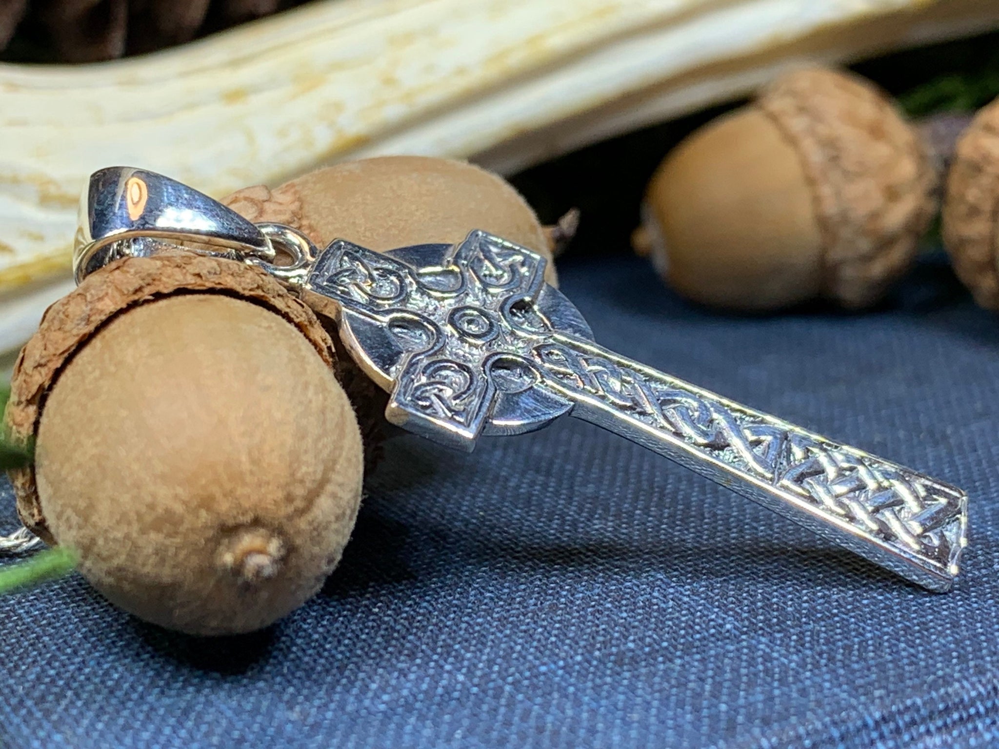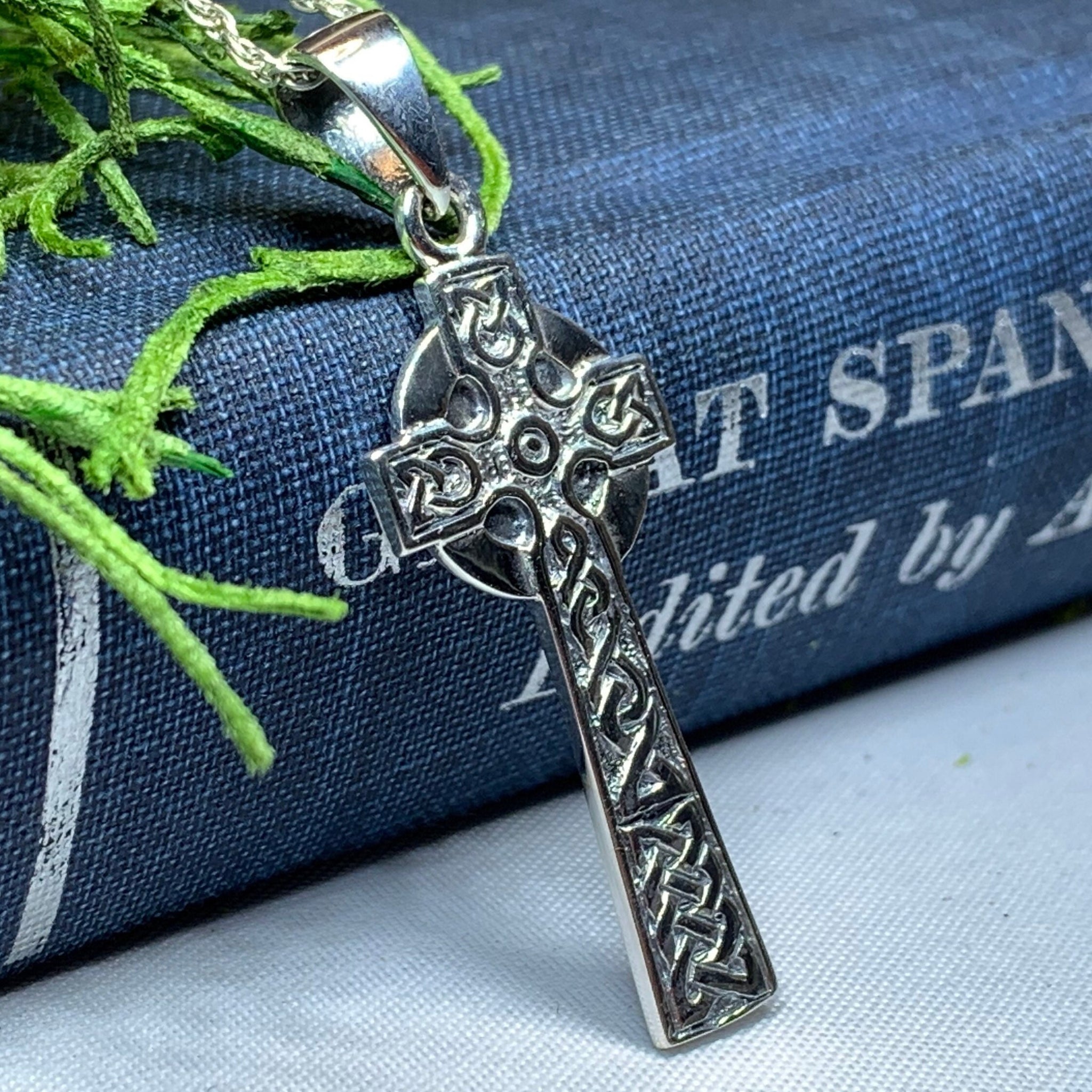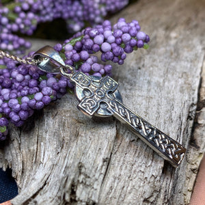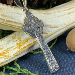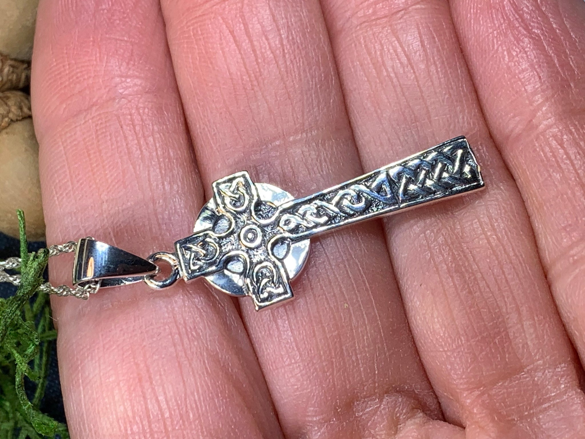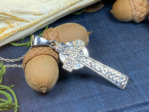 This knot work cross pendant is cast in sterling silver and has an intricate design reminiscent of classic Celtic crucifixes. Makes a beautiful gift.