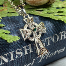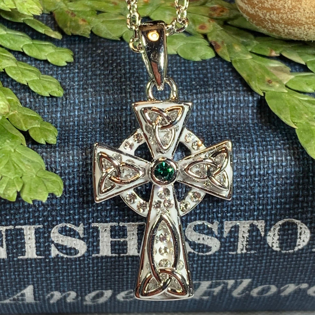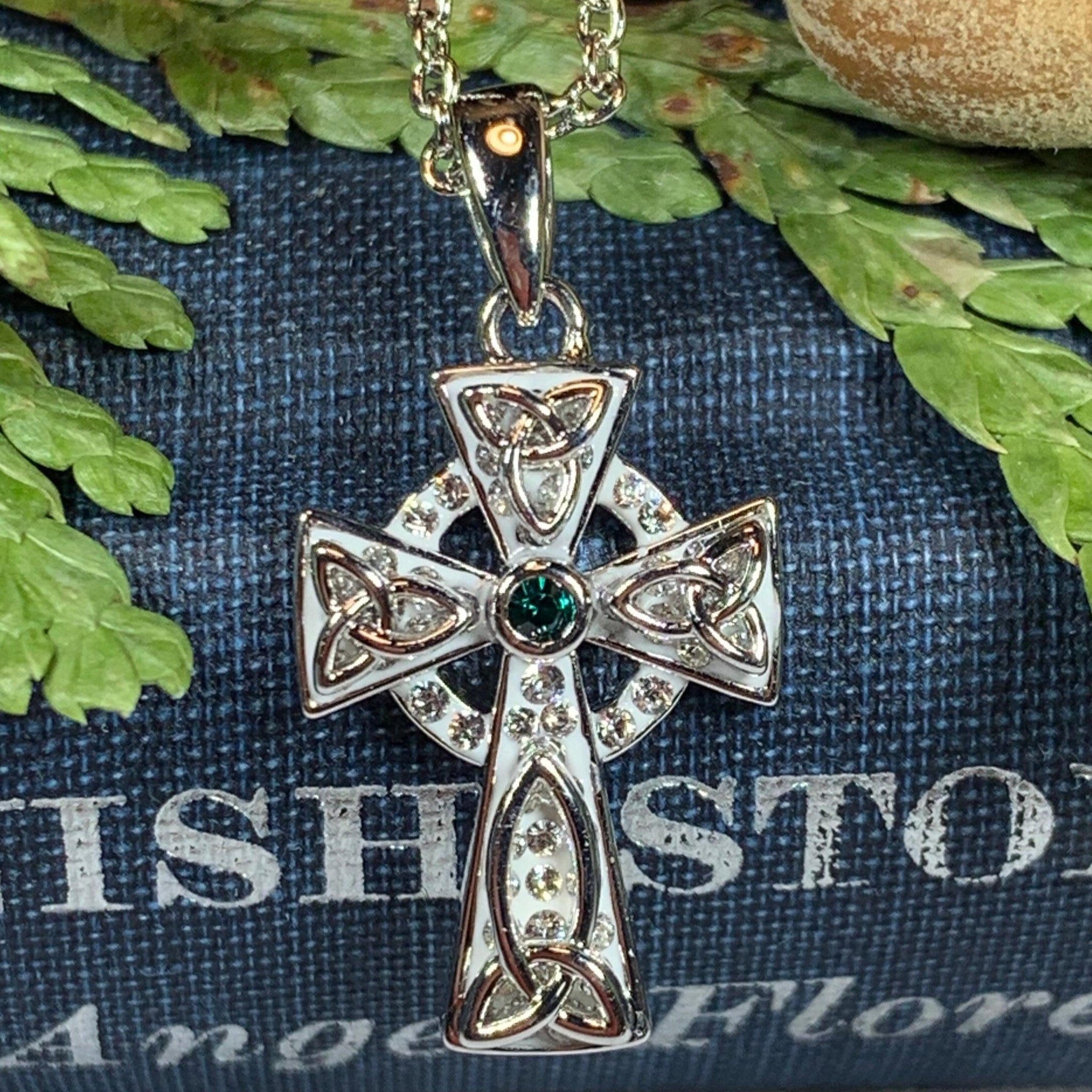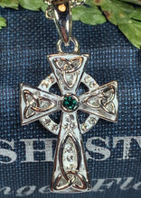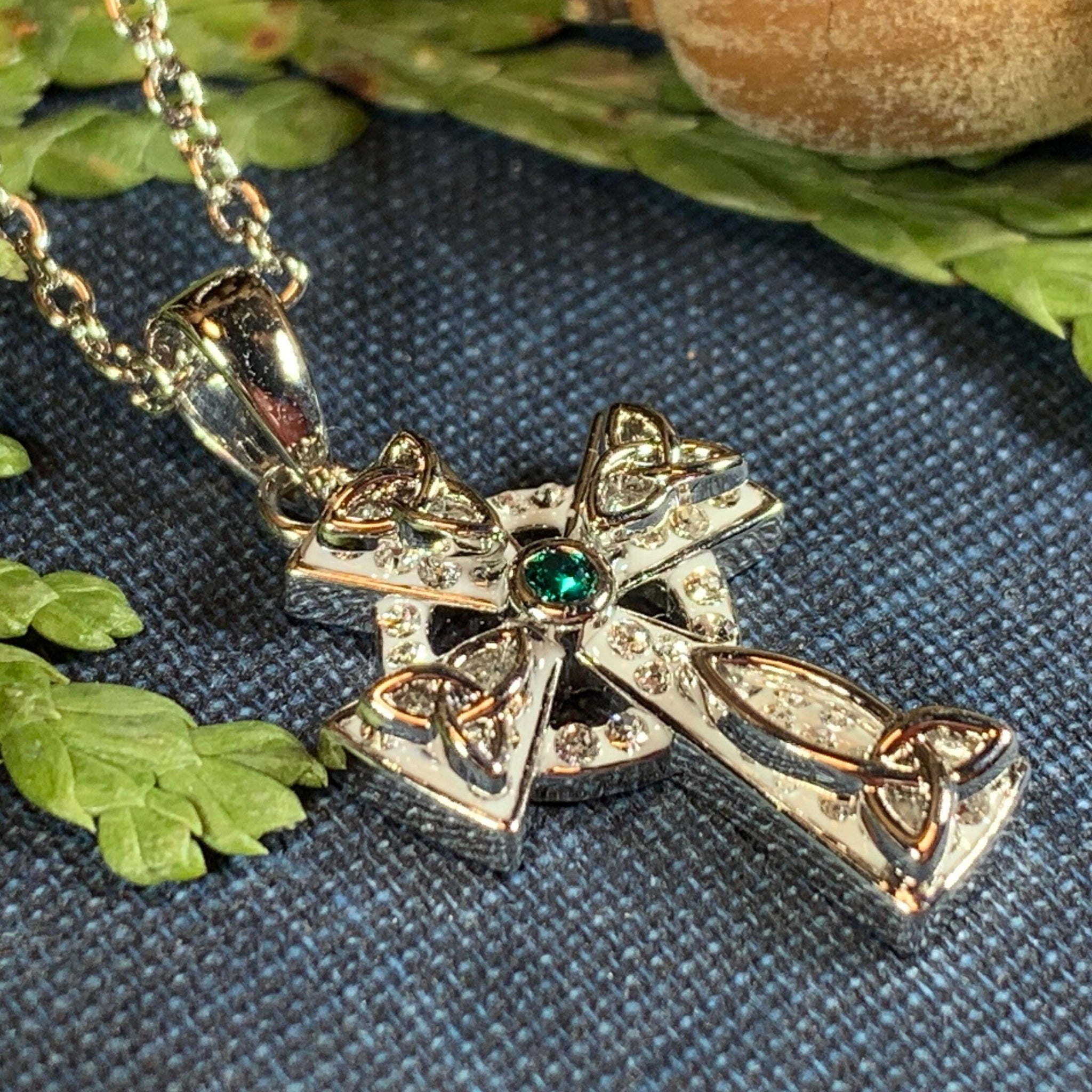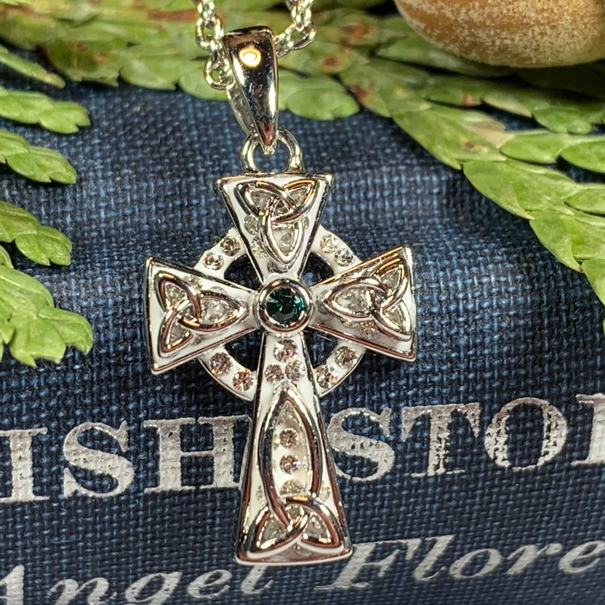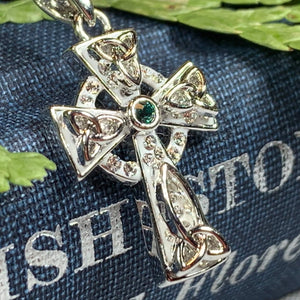 1 1/4" x 1" solid sterling silver cross with center amethyst or blue topaz gemstone and marcasite on an 18" chain. Hallmarked 925