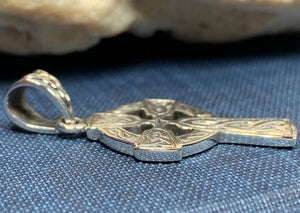 This knotwork cross pendant is cast in sterling silver and has an intricate design reminiscent of classic Celtic crucifixes. Makes a beautiful gift.