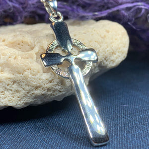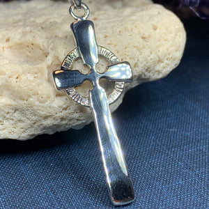 The simple design of this handmade cross is beautiful! The contrast of the hammered detailing Celtic circle with the highly polished silver of the cross arms make this piece extra special.