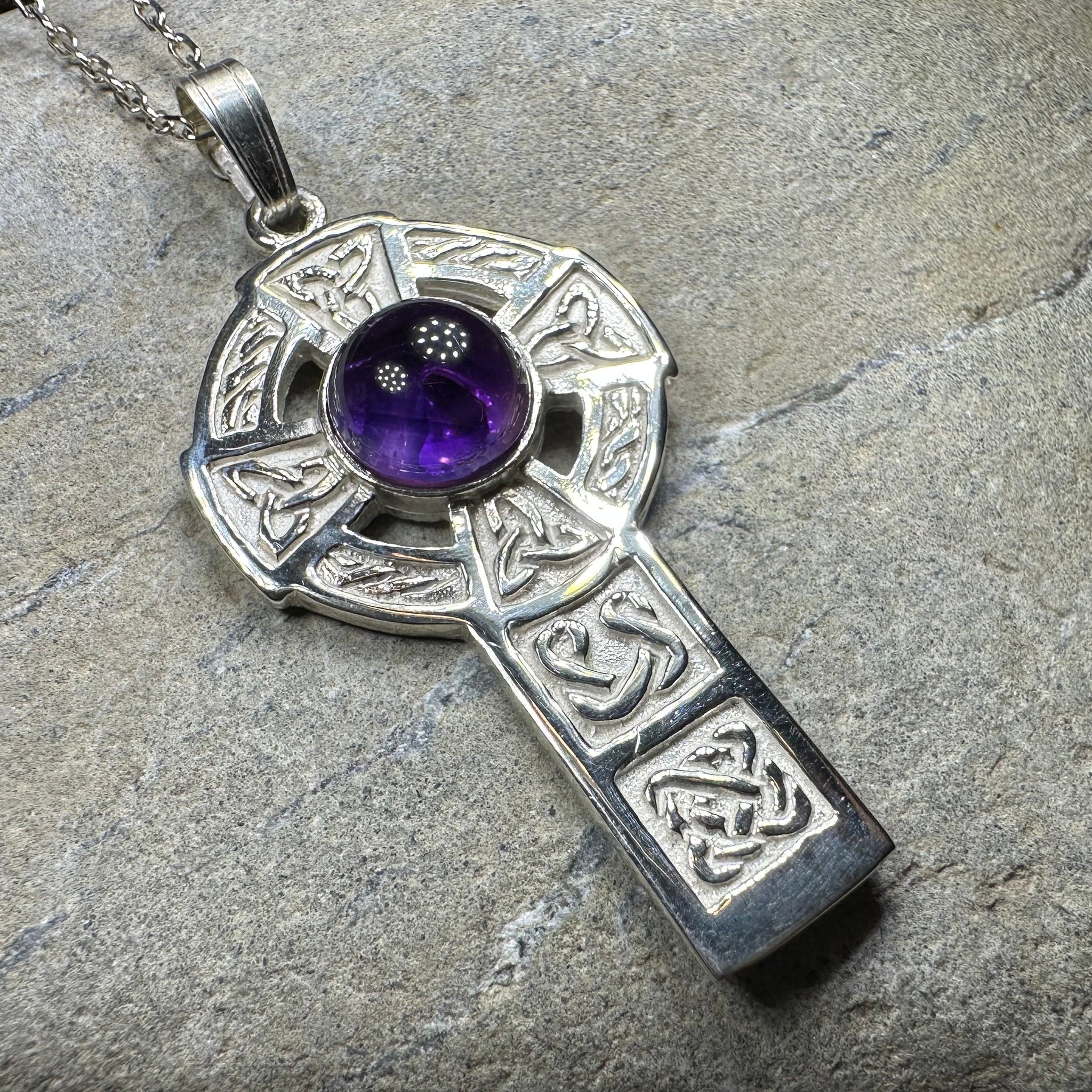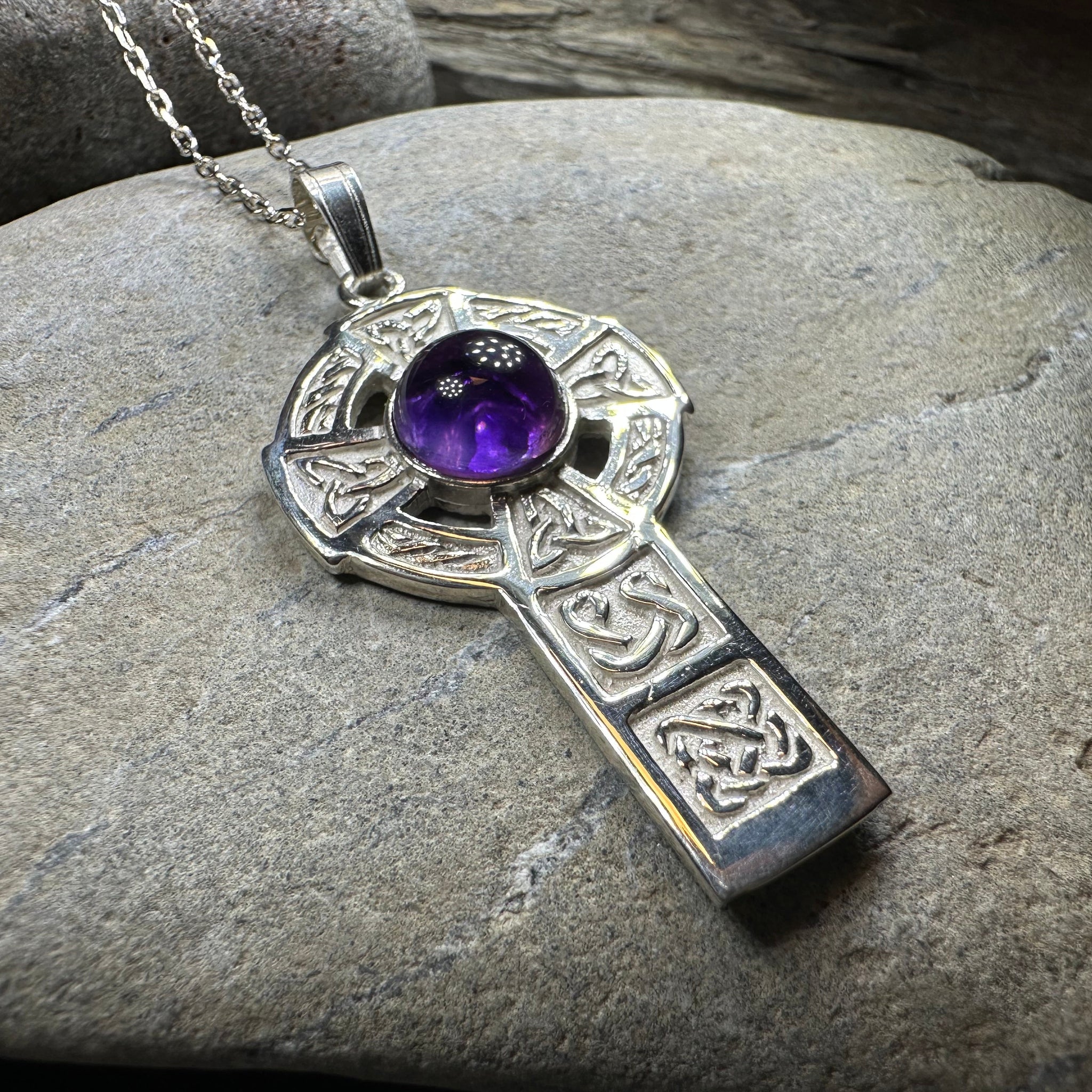 This beautiful solid sterling silver Celtic Cross has a two carat amethyst stone and Celtic knot detailing.