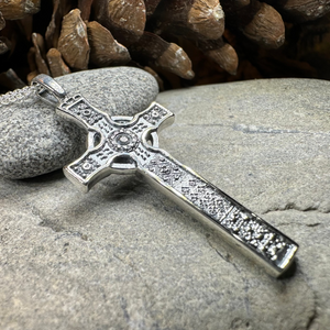 A highly attractive large Celtic Sterling Silver Cross, with a design based on a traditional stone carved Celtic Cross found in Iona, Scotland.