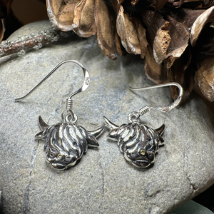 Who doesn't love a coo? Highly attractive solid sterling silver Scottish Highland Cow Silver Earrings with a traditional design featuring the famous Scottish Cow, the cutest cow in all of Scotland. It will delight lovers of all things Scottish - Crafted entirely of 925 sterling silver. A golden cubic zirconia gemstone represents the golden color of these animals and adds a touch of sparkle.