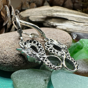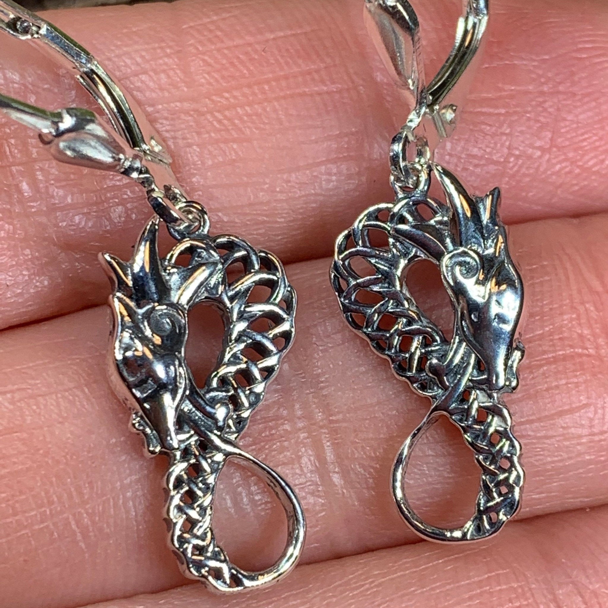 Beautifully detailed dragon heads whose neck is designed with scrolling open work Celtic weave - an intricate head with Celtic knot detailing. Bright sterling silver earrings that will be treasured for a lifetime.