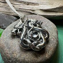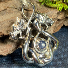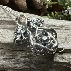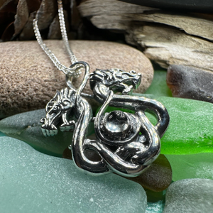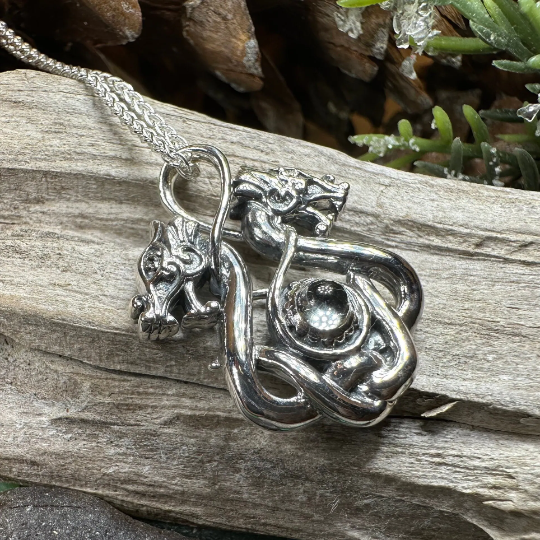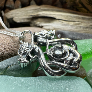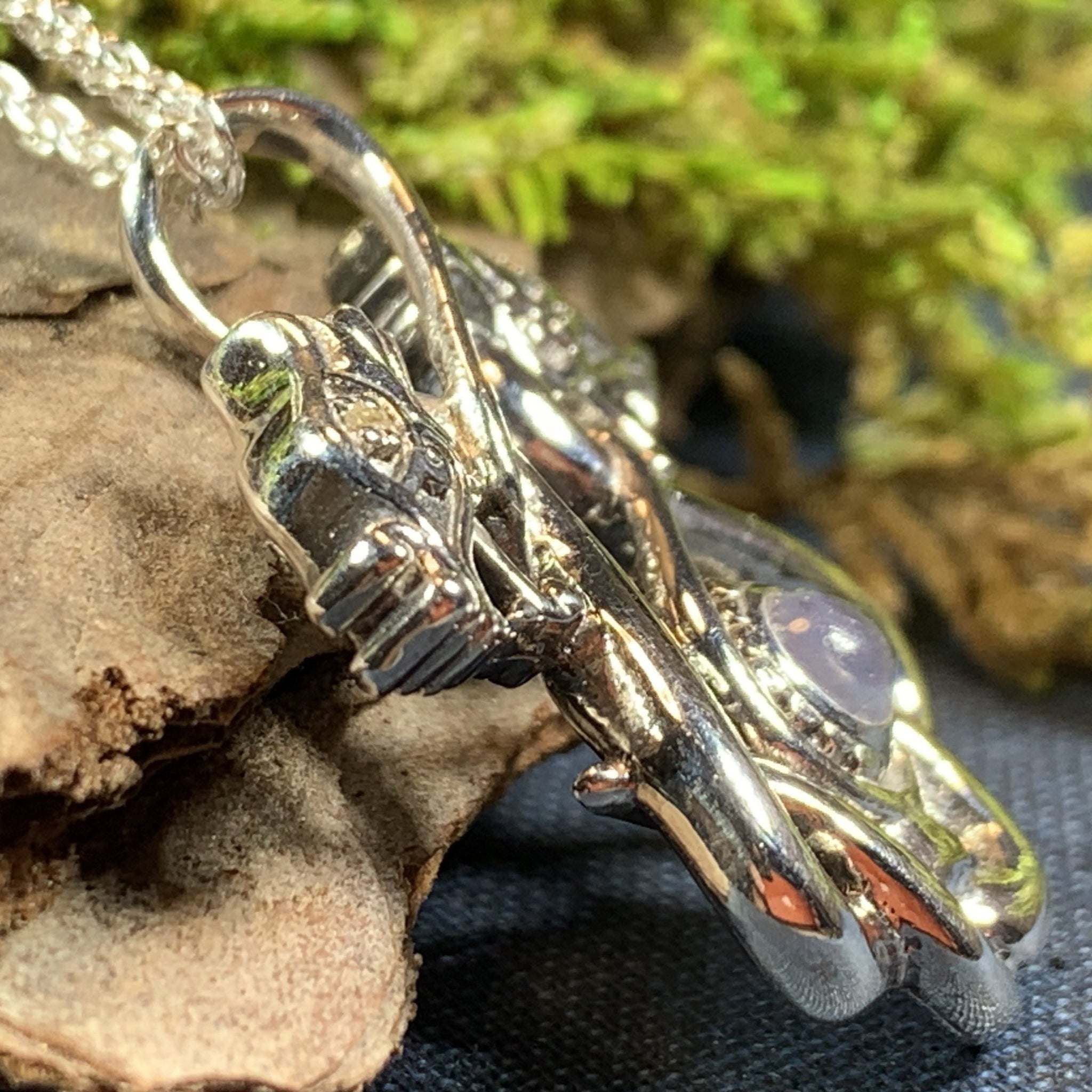A beautifully detailed rising dragon with a twisting body forming a scrolling Celtic inspired design - an intricate dragon with a mysterious pink mother of pearl or red agate focal stone. The line of the dragon's body is set with sparkling marcasite gems.