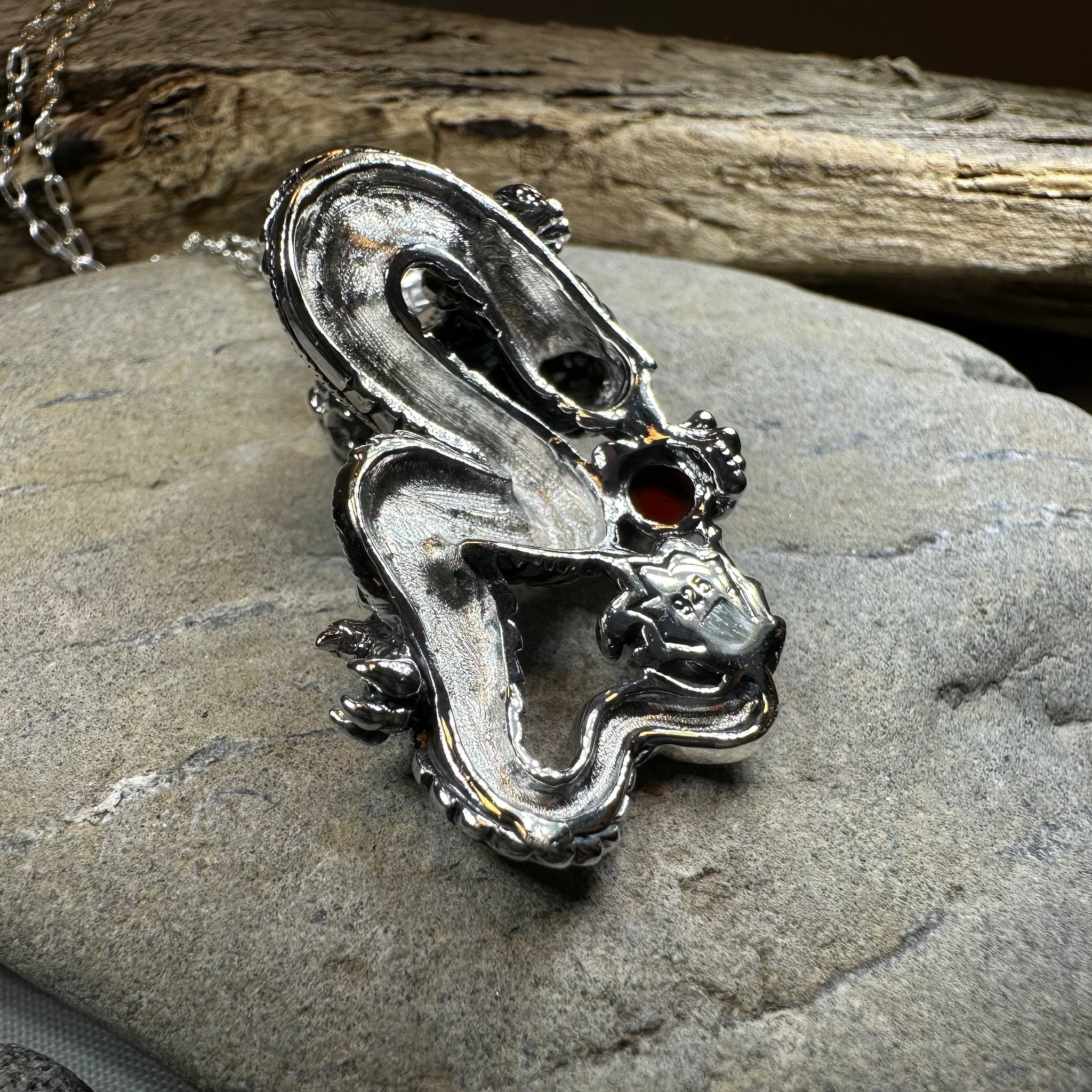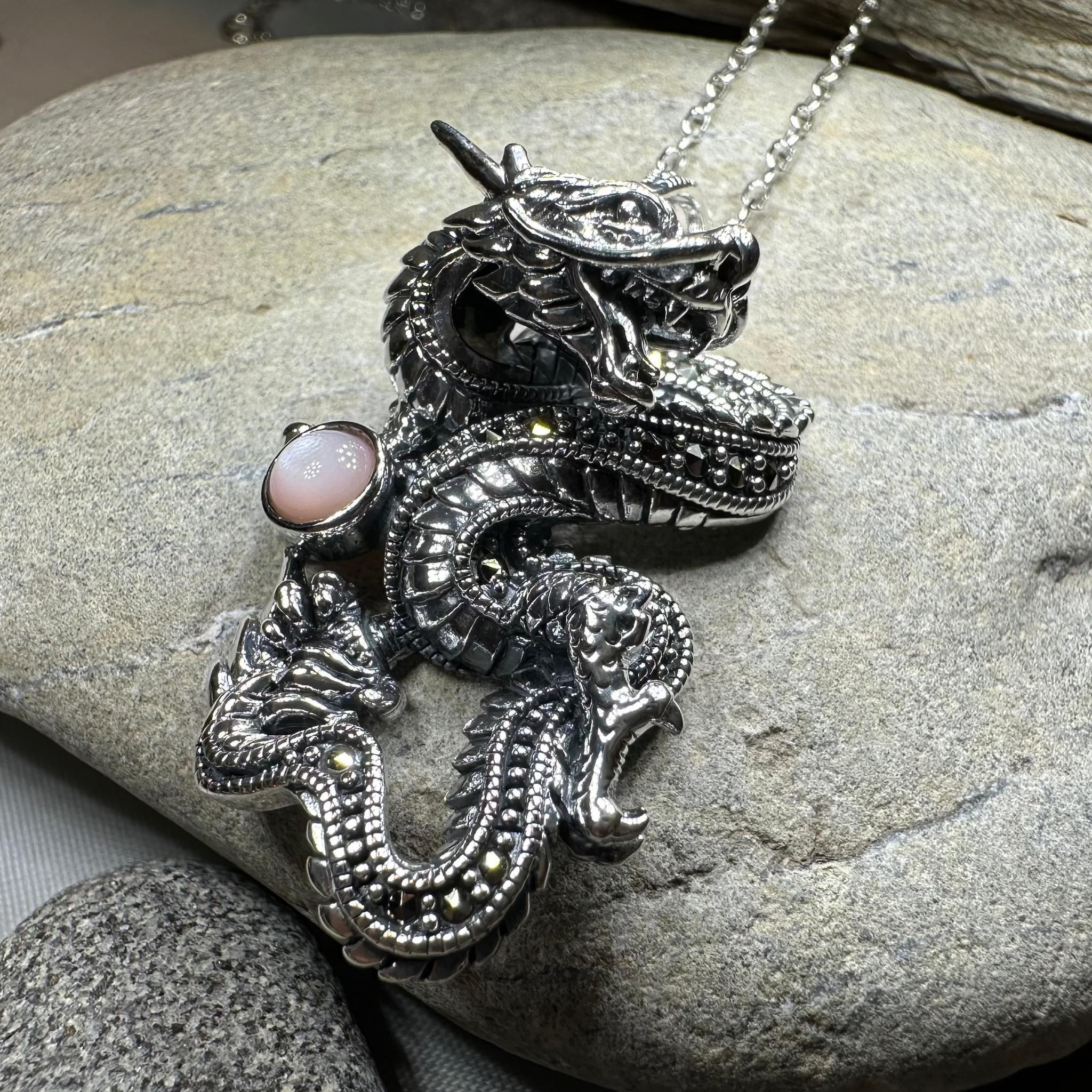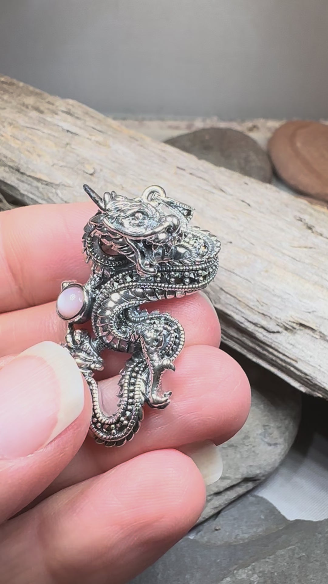 A beautifully detailed rising dragon with a twisting body forming a scrolling Celtic inspired design - an intricate dragon with a mysterious pink mother of pearl or red agate focal stone. The line of the dragon's body is set with sparkling marcasite gems.
