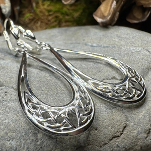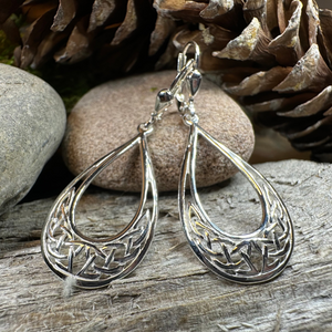 Marquise shaped Celtic Knot drop earrings. The rich heritage of Ireland is beautifully showcased in these earrings which feature the spiral which dates from the megalithic period in Ireland, and the trinity knot, examples of which can be seen in Ireland ancient manuscripts.